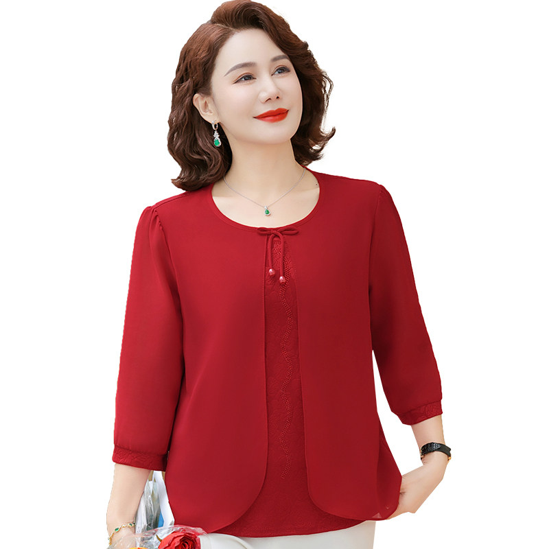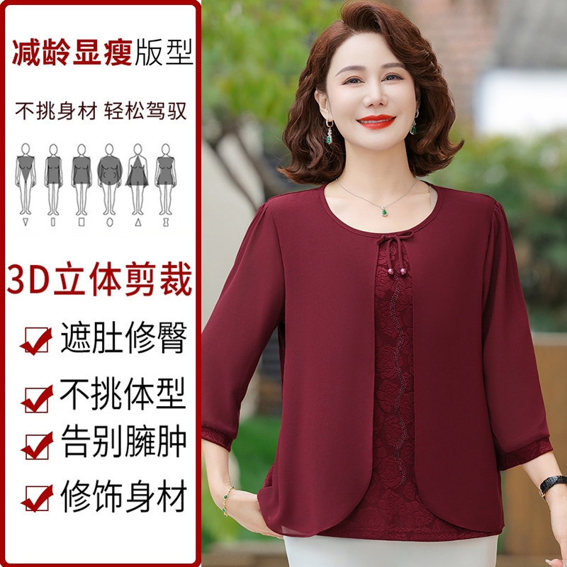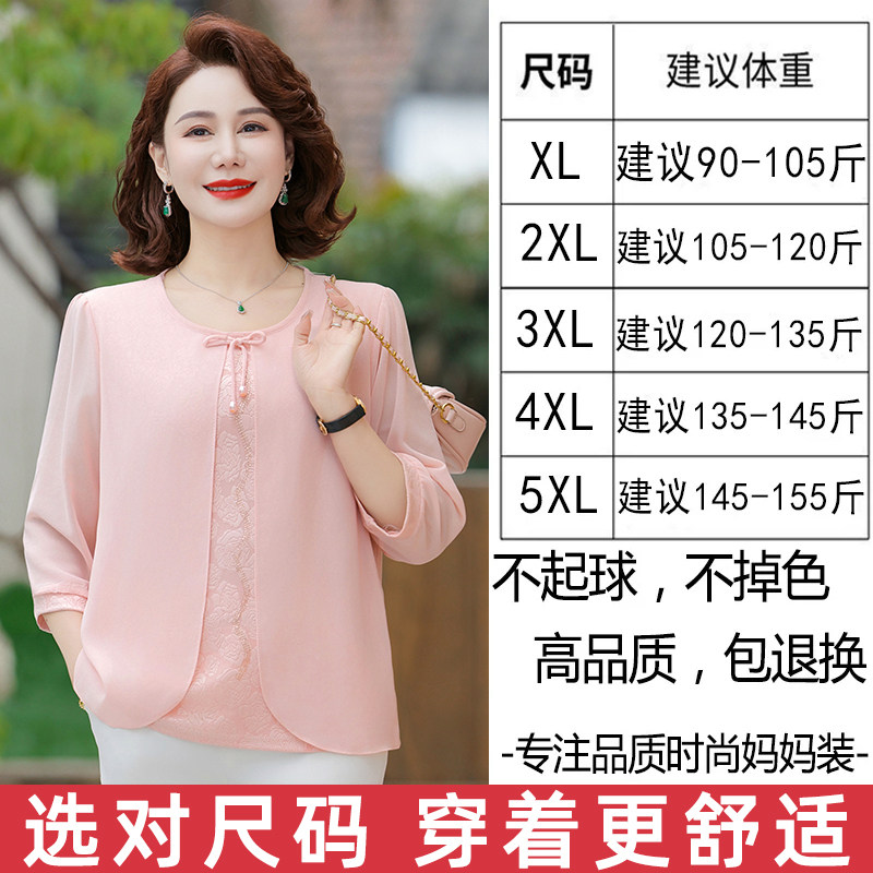 雅鹿中年妈妈春夏七分袖雪纺小衫洋气中老年女夏季新款时尚假两件