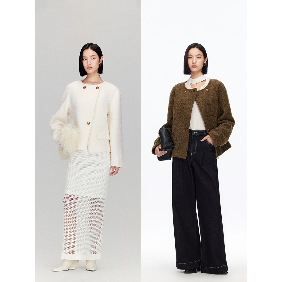 毛呢材质 软糯舒适;金属纽扣 精美细节