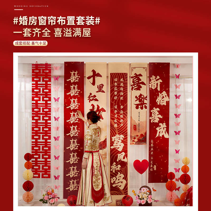 结婚窗帘装饰拉花挂饰婚礼婚房新房布置男方女方卧室客厅长条喜字