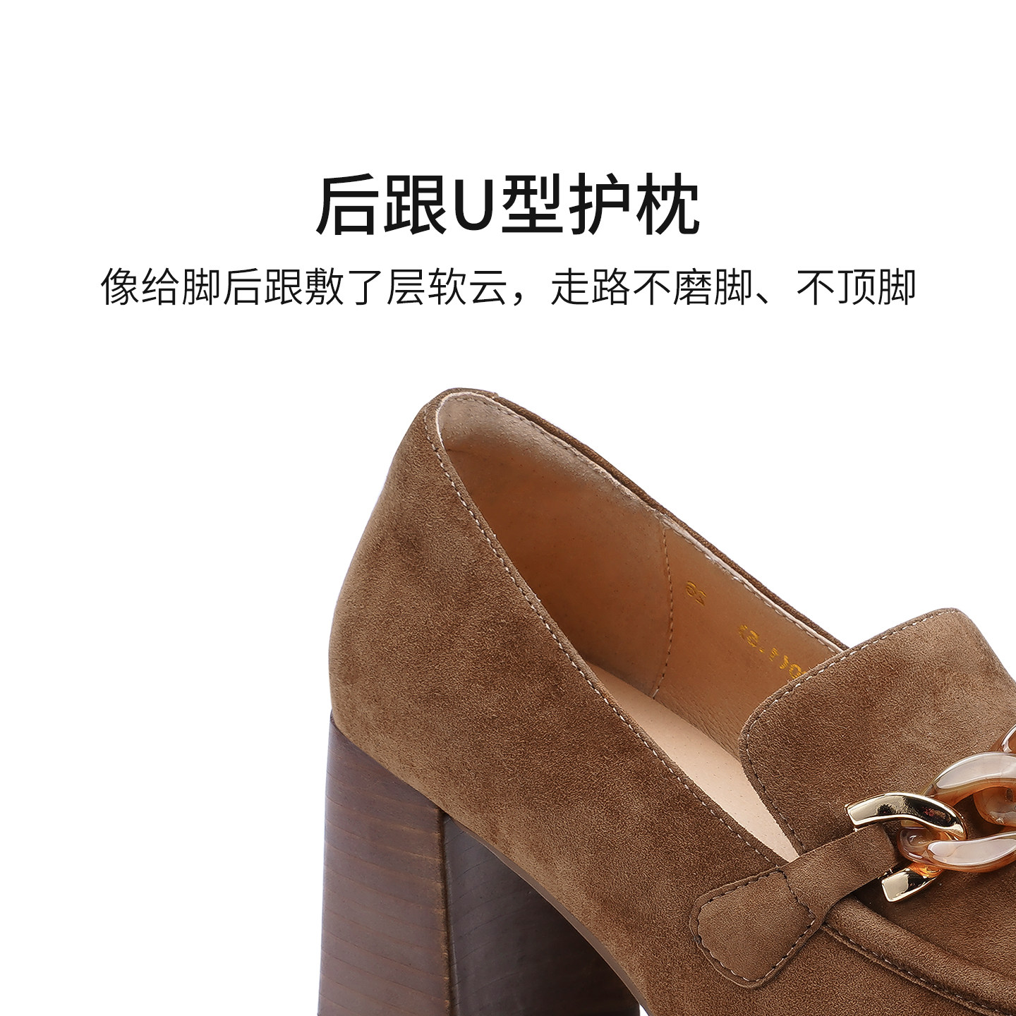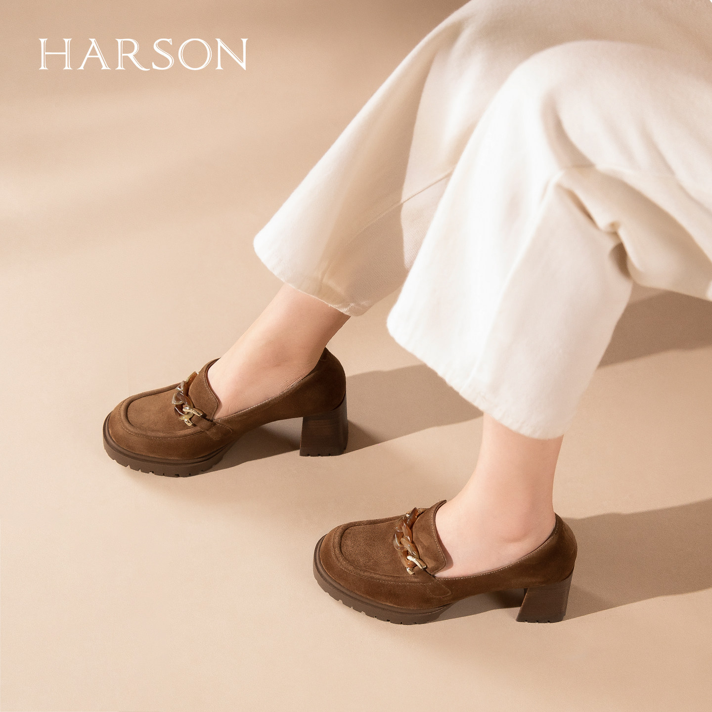哈森粗跟增高一脚蹬高跟绒面乐福鞋舒适百搭女鞋2026新款HS267158