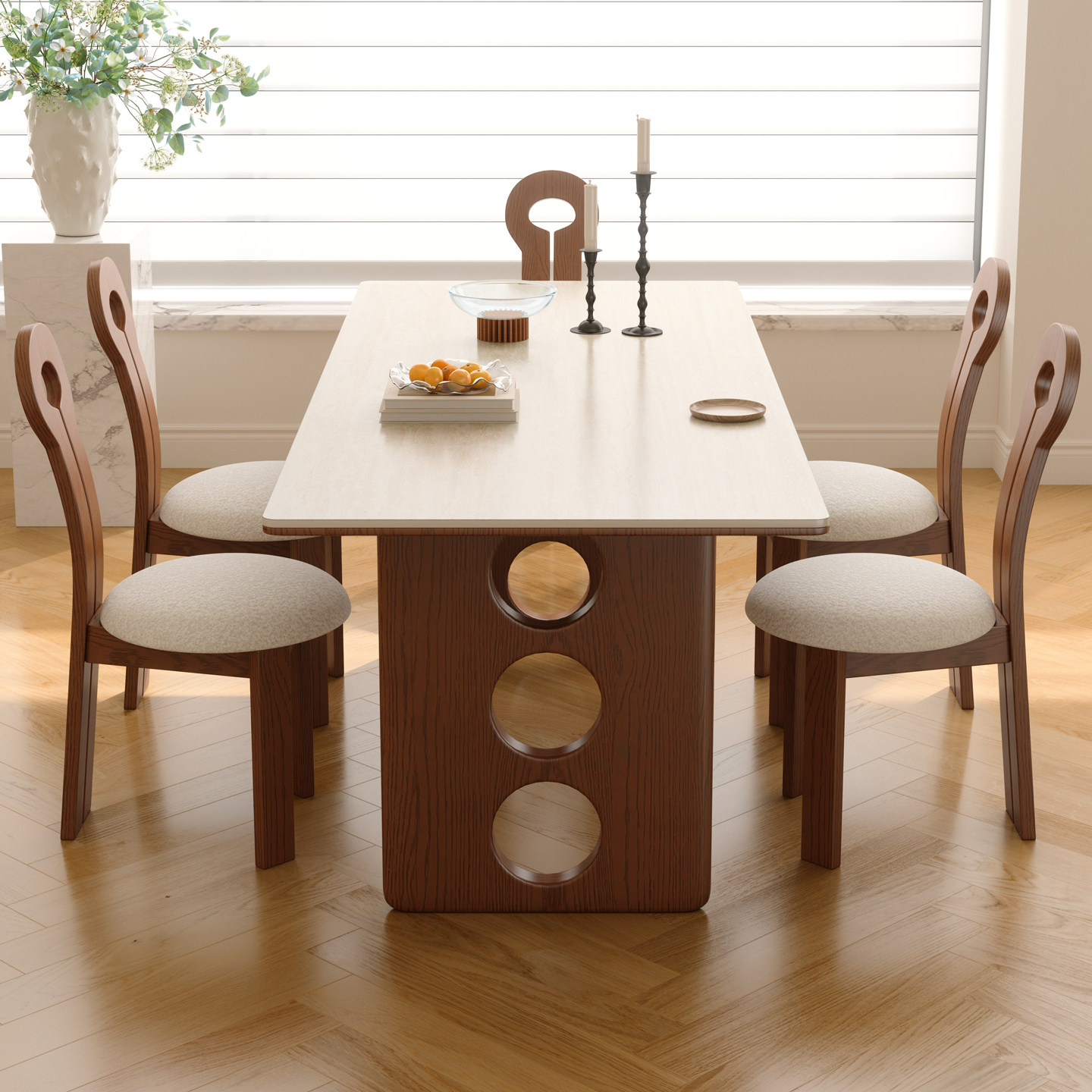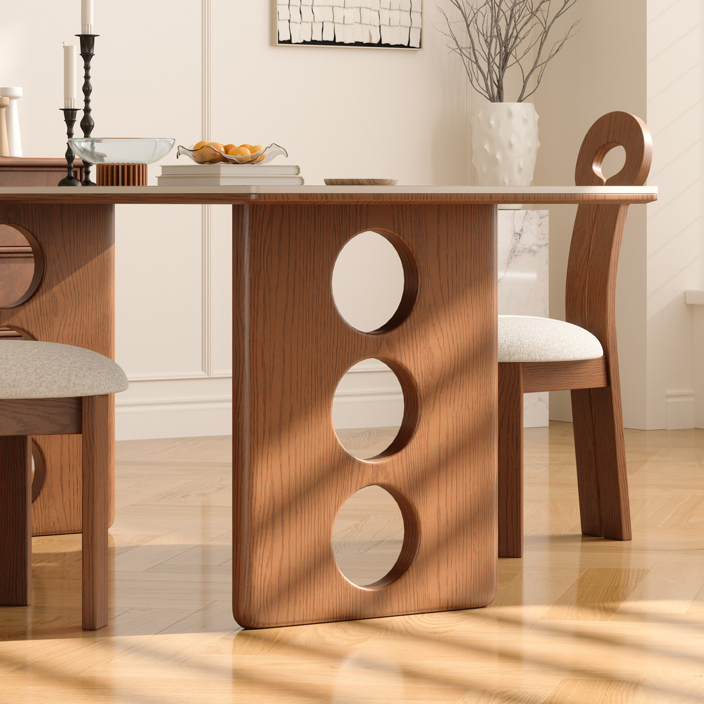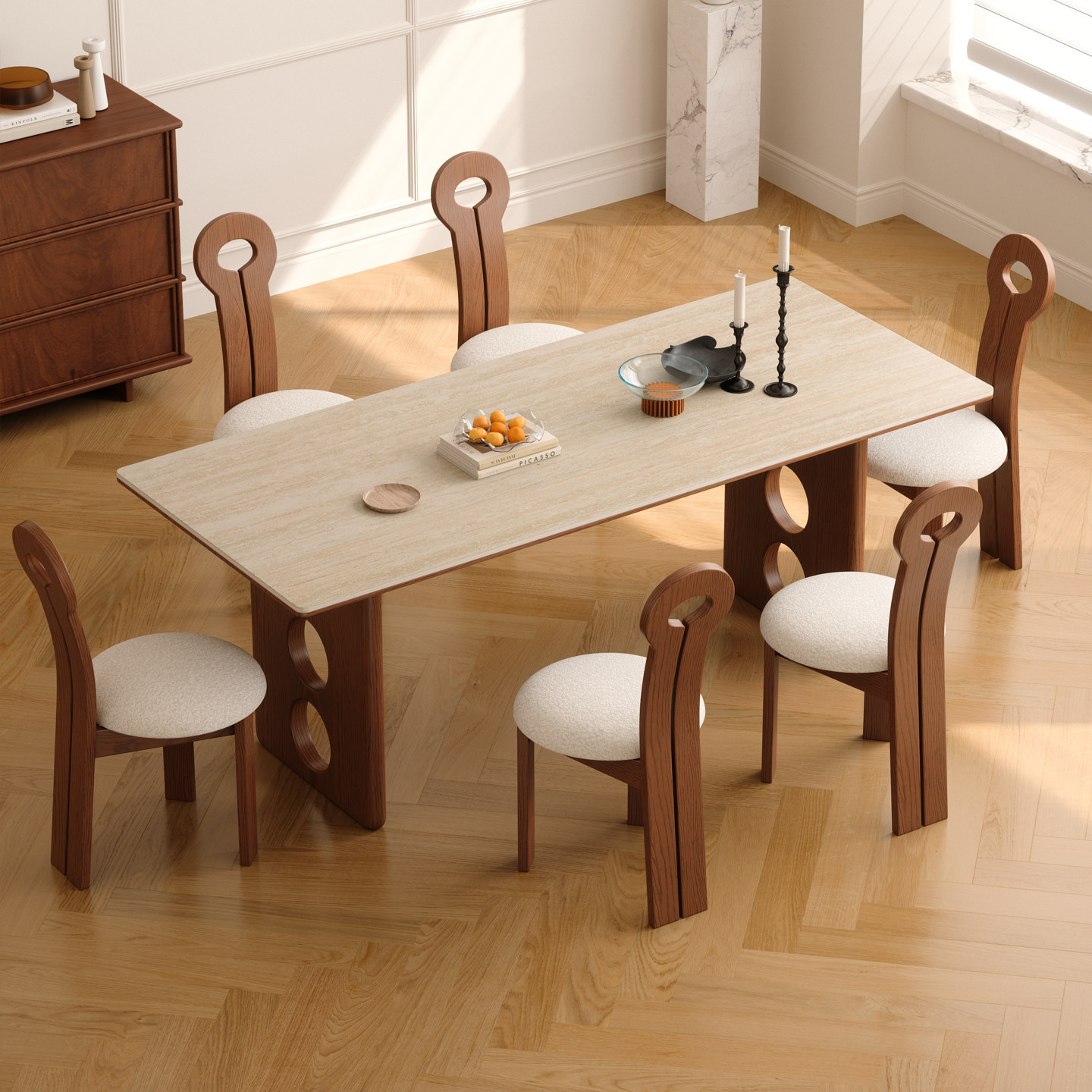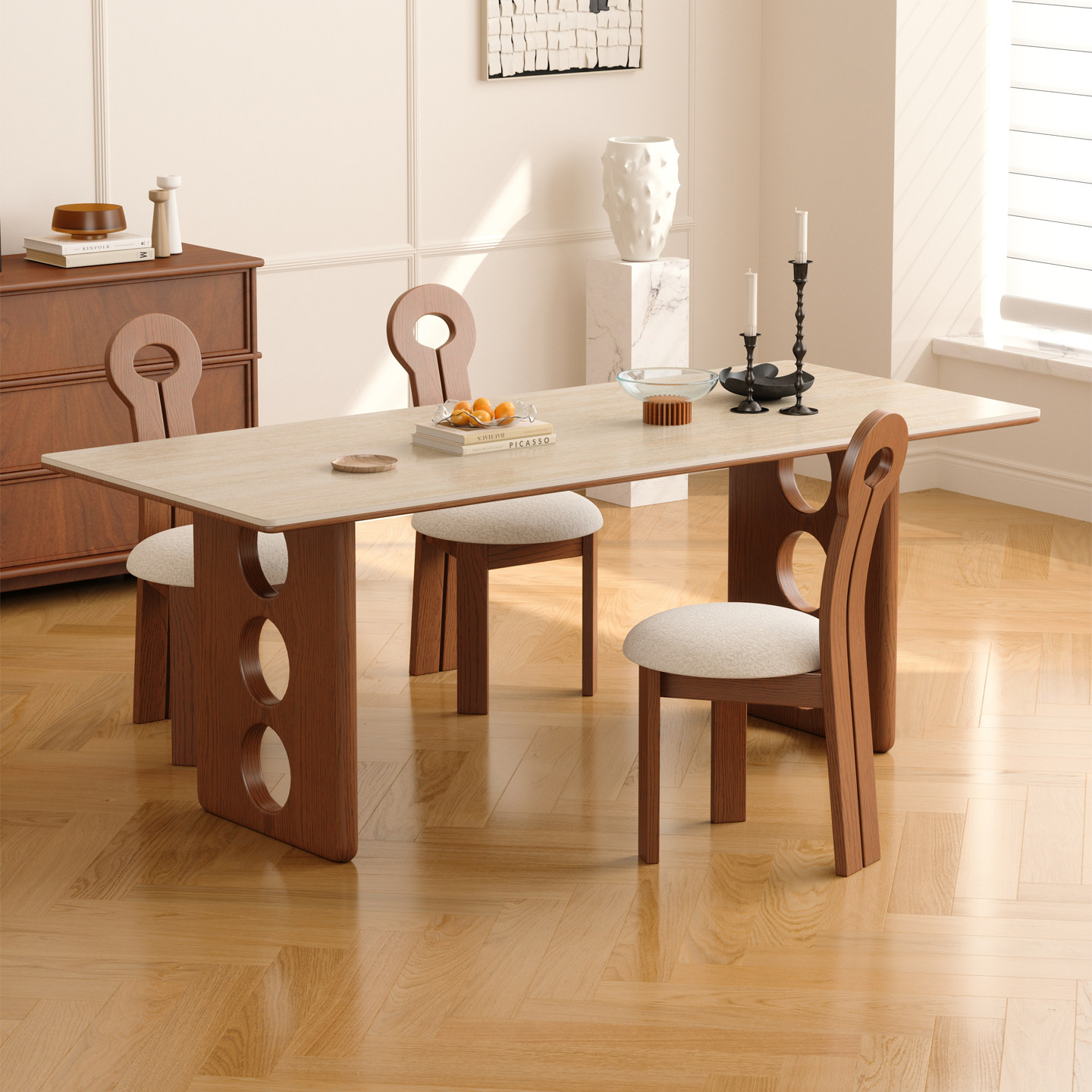 木小咖中古风实木长方形餐桌家用高端饭桌设计款复古洞石岩板餐桌