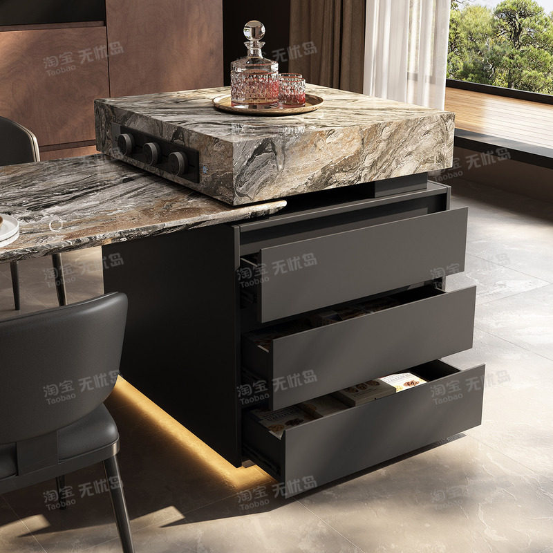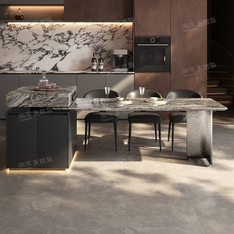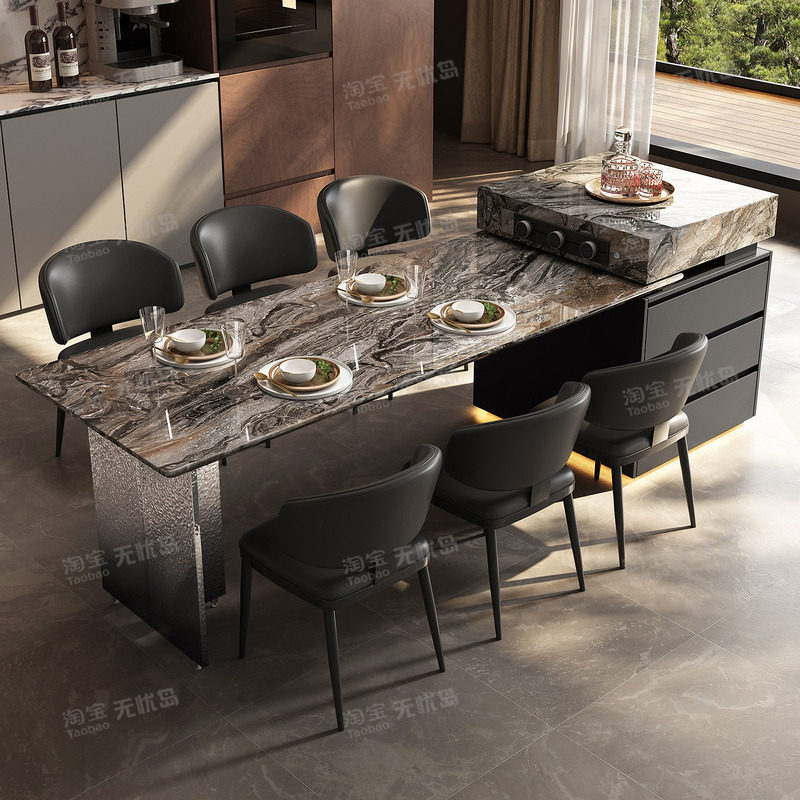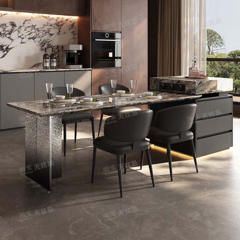 天然奢石岛台餐桌一体威尼斯棕家用饭桌意式轻奢别墅客厅设计师款