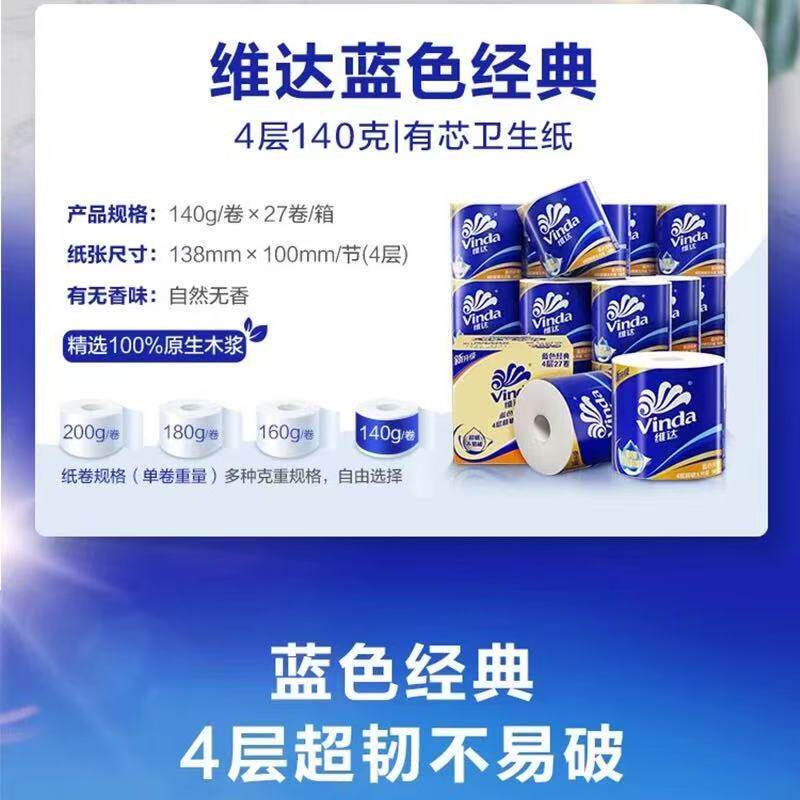 【孙颖莎推荐】维达卷纸蓝色经典有芯4层200g卫生纸巾家用实惠装