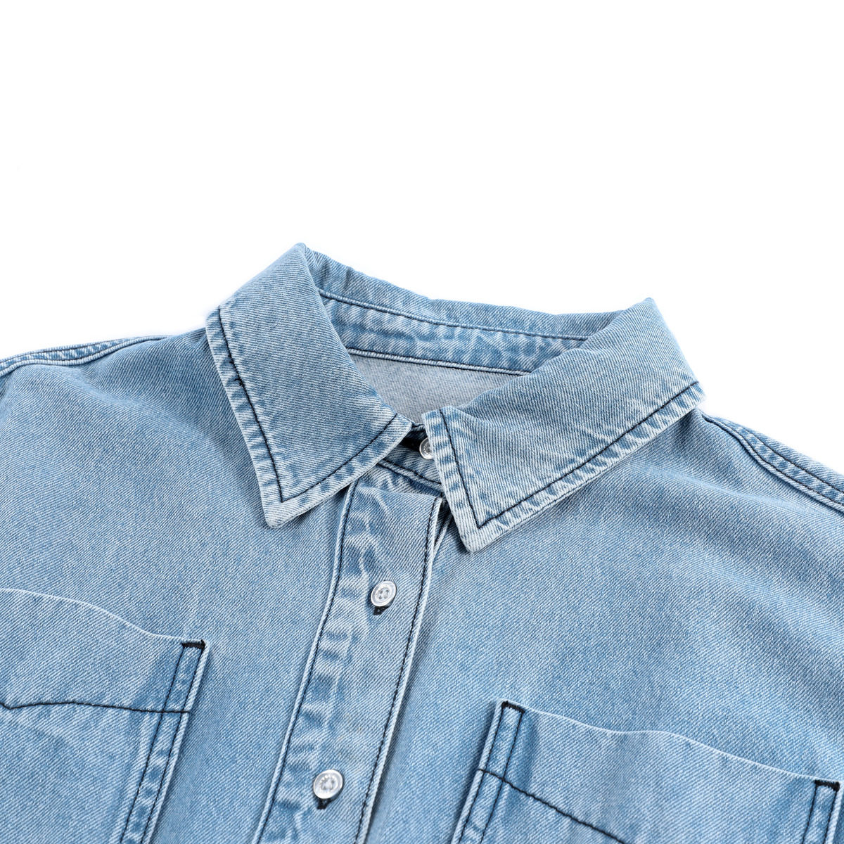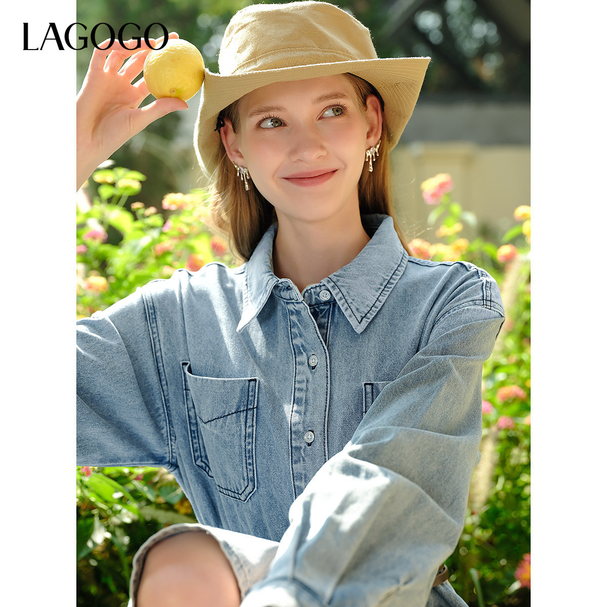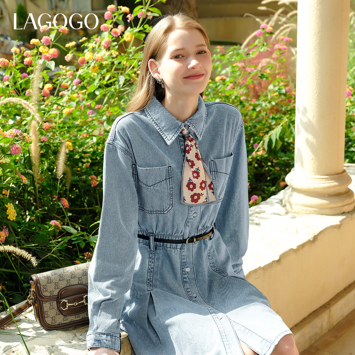 LAGOGO百搭长袖牛仔连衣裙女拉谷谷春秋款纯棉收腰百褶气质裙子