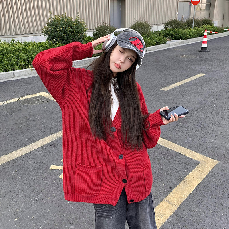 回力开衫V领毛衣男秋冬季2024新款宽松休闲潮牌复古针织毛衫外套