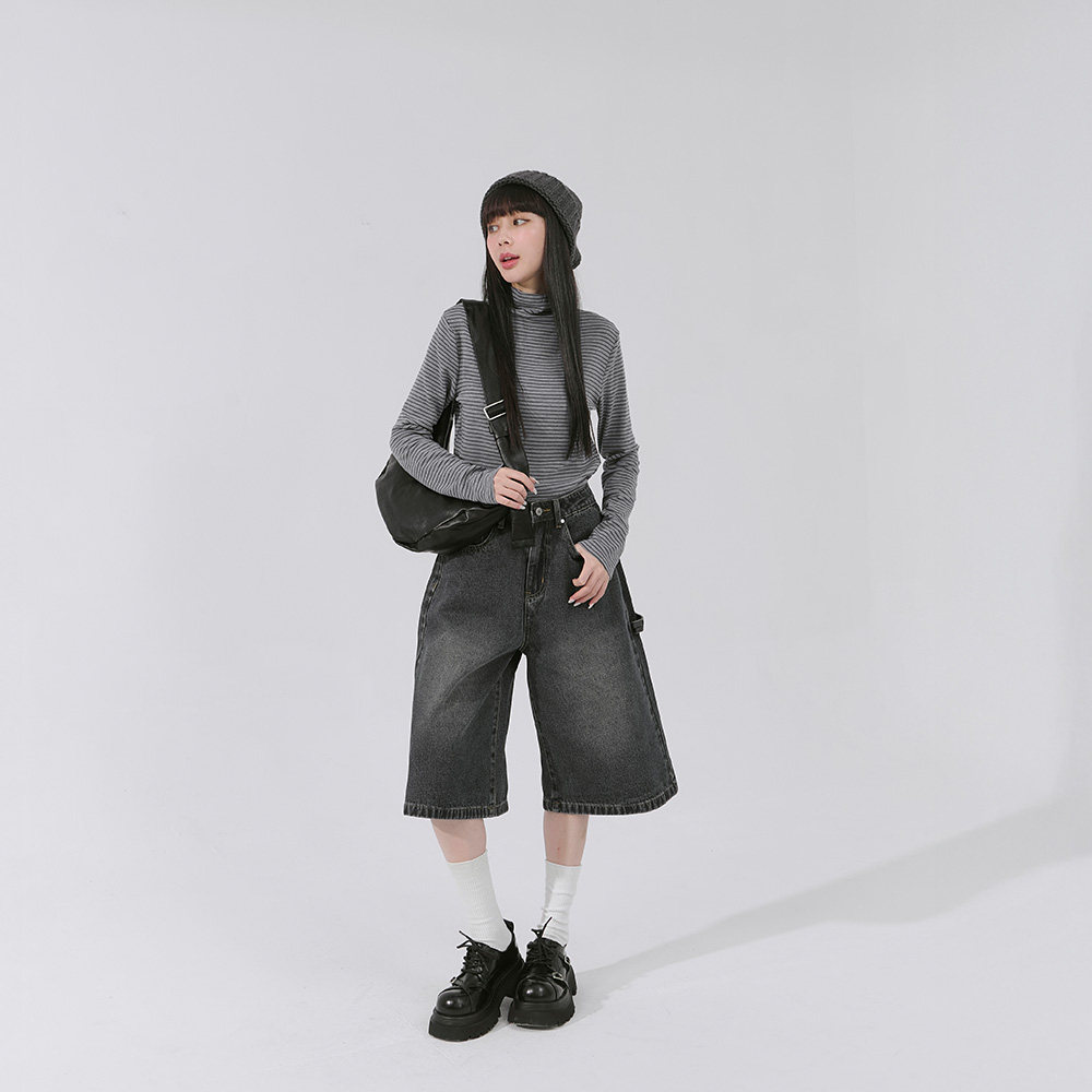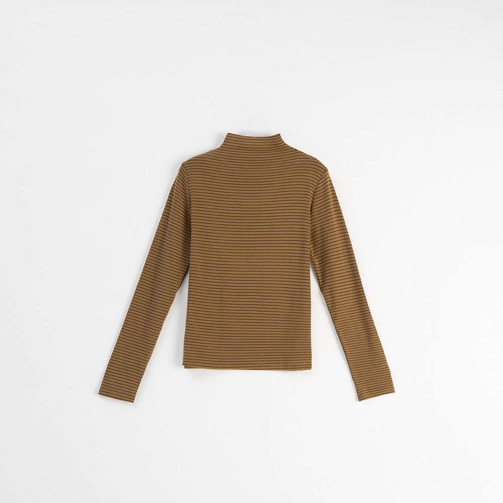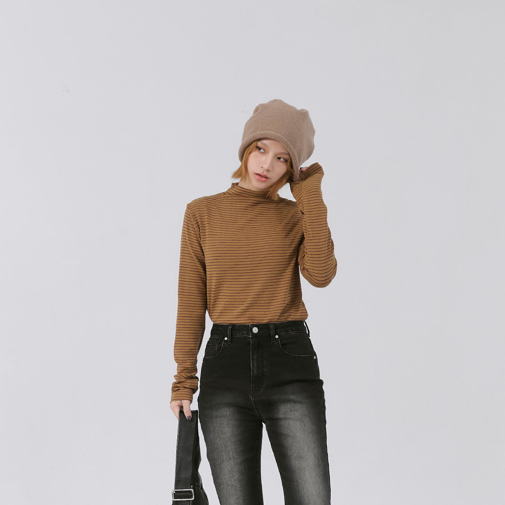 QUEENSHOP 2025秋冬新品女装条纹造型微高领修身长袖上衣01099459