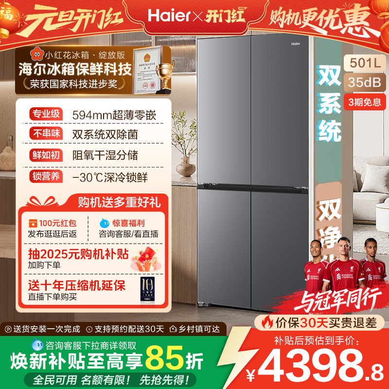 【双系统】海尔小红花501L双开四门超薄零嵌入式风冷无霜家用冰箱