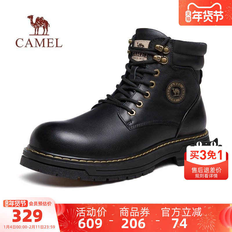 骆驼男鞋2025冬季新款牛皮黑色工装靴子大圆头时尚英伦复古马丁靴