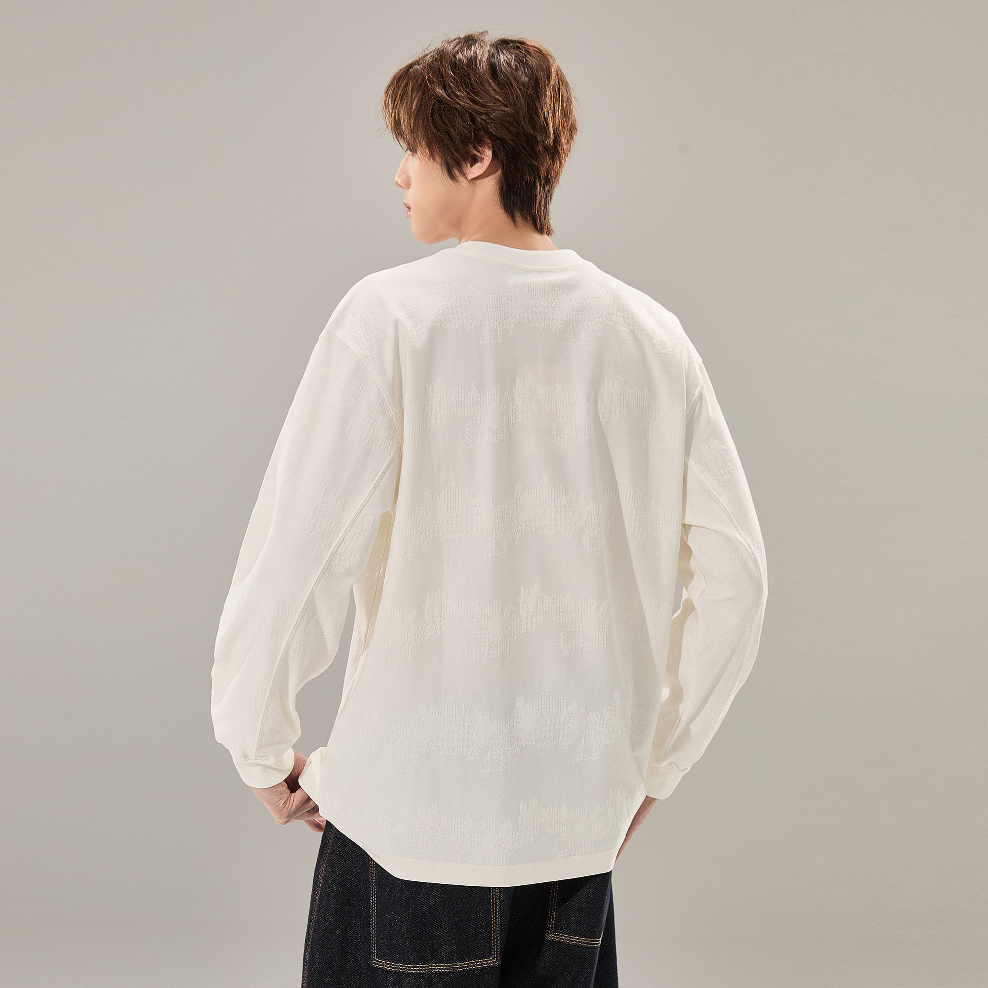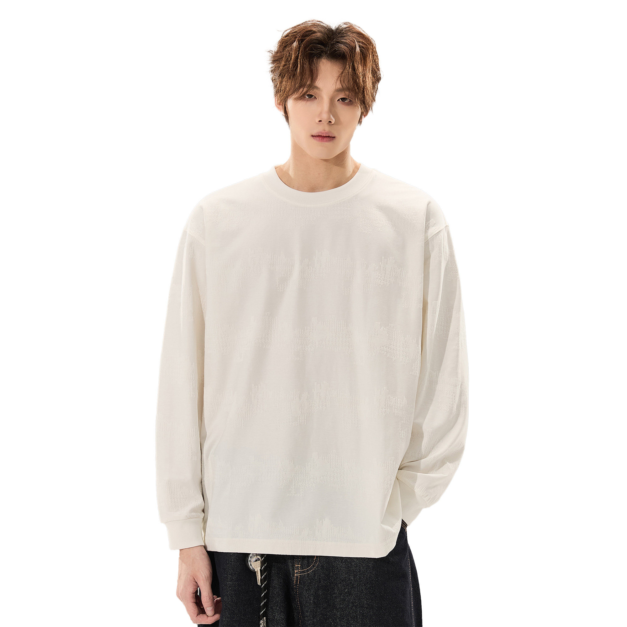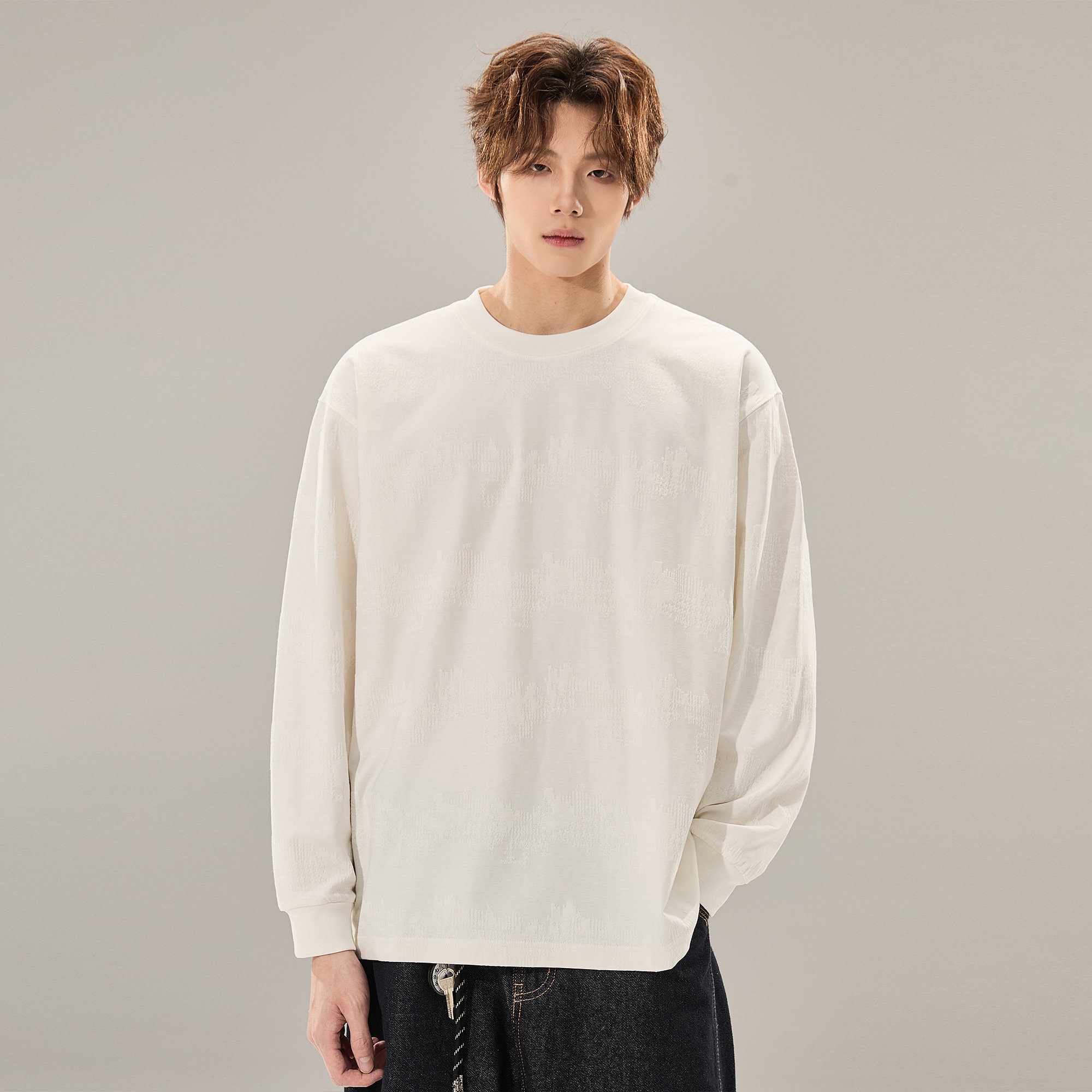 ALLIN 白色重磅长袖T恤男春秋提花暗纹百搭打底衫情侣款圆领上衣