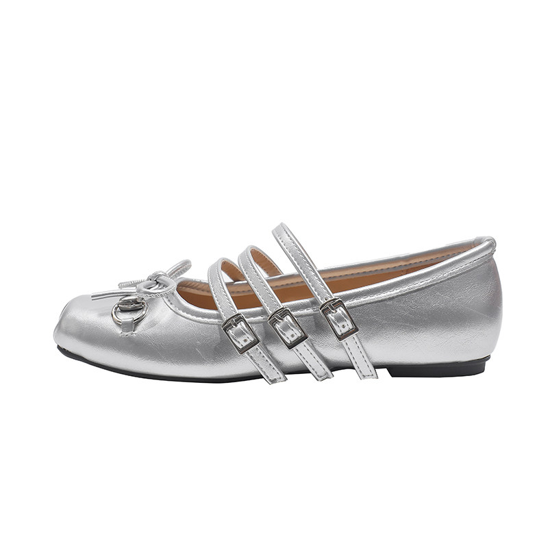 羊皮版~银色玛丽珍鞋女春平底配裙子一字带法式芭蕾单鞋大码女鞋