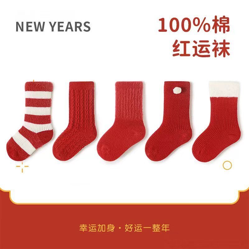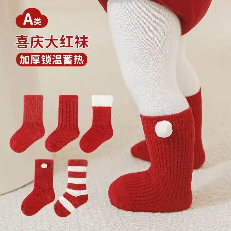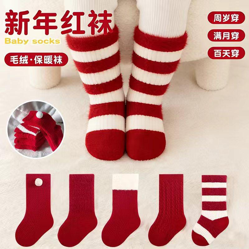 婴儿袜子加绒加厚秋冬季保暖新生儿宝宝满月周岁新年松口大红色袜