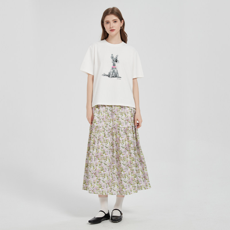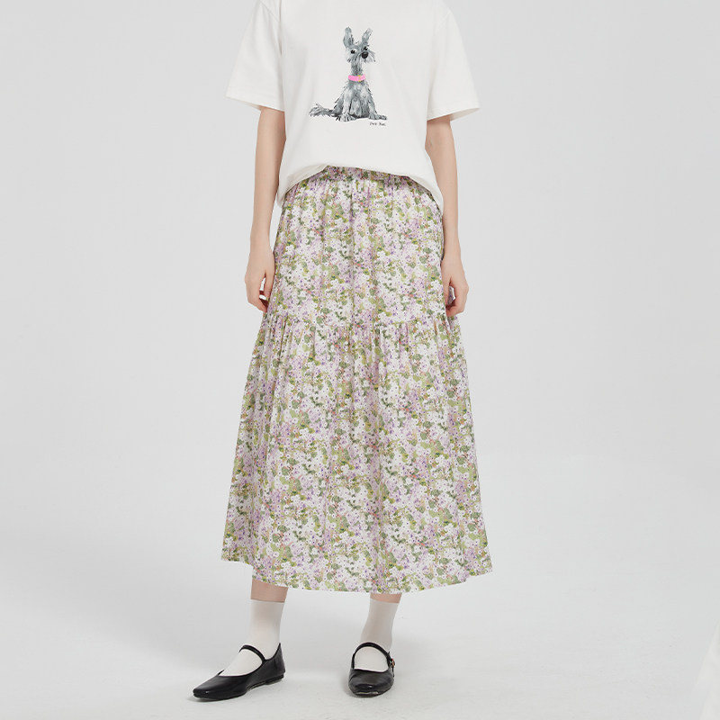 Petit Bari艺术印花A字碎褶拼接棉质半身裙女 松紧腰碎花中长裙