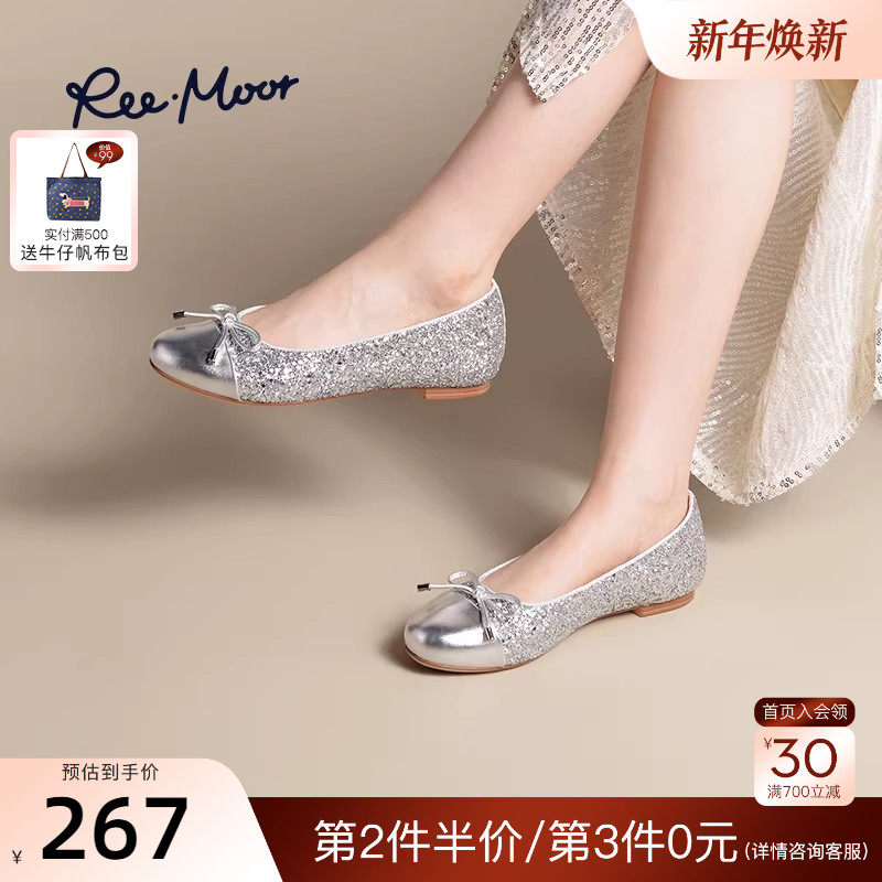 REEMOOR睿慕2025新款小香风浅口单鞋亮片圆头平底蛋卷鞋女鞋