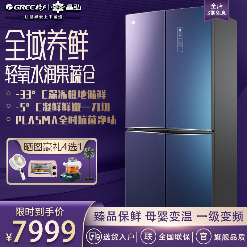 格力晶弘冰箱四开十字对开门家用智能变频风冷无霜净味大容量516L
