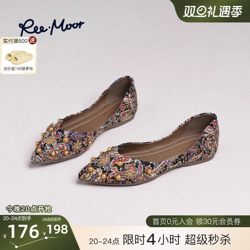 REEMOOR睿慕2025秋新款民族风尖头单鞋平底浅口水钻软底舒适女鞋
