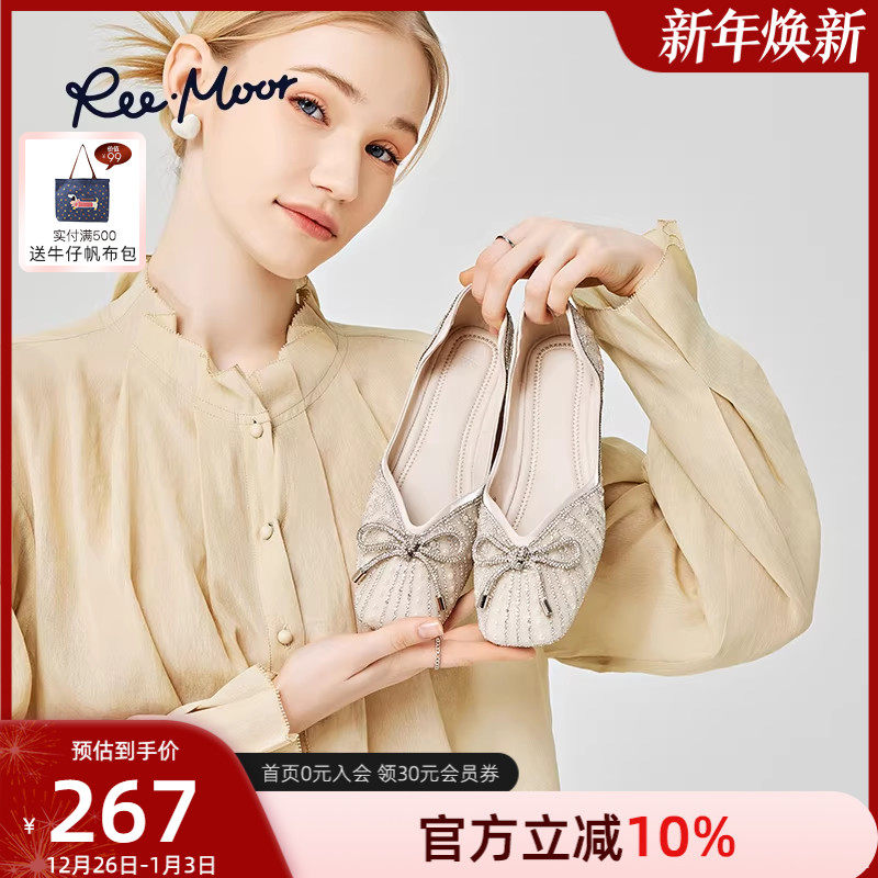REEMOOR睿慕水钻单鞋女2025秋新款浅口珍珠蝴蝶结船鞋平底鞋婚鞋