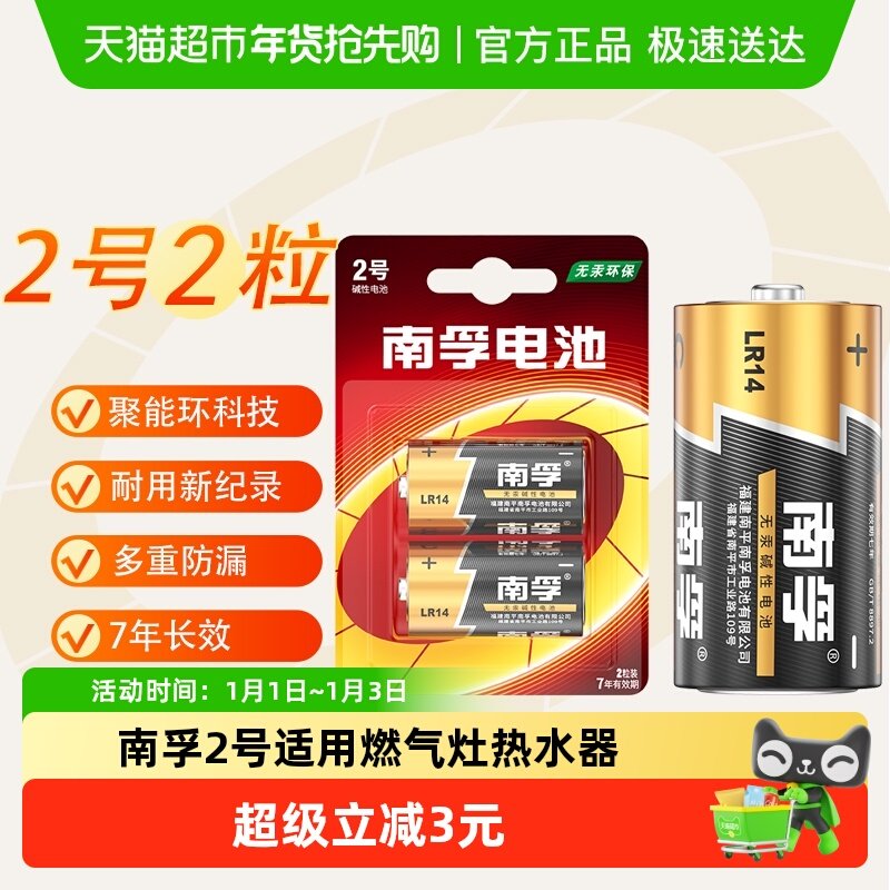 南孚2号干电池2粒装二号碱性大电池1.5V适用热水器手电筒