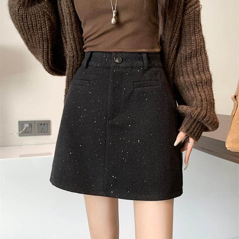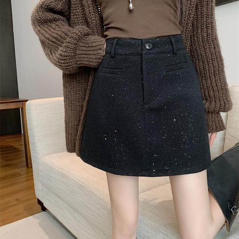 亮闪闪毛呢半身裙秋冬女大码高腰小个子包臀裙小香风亮片A字短裙