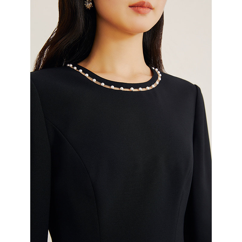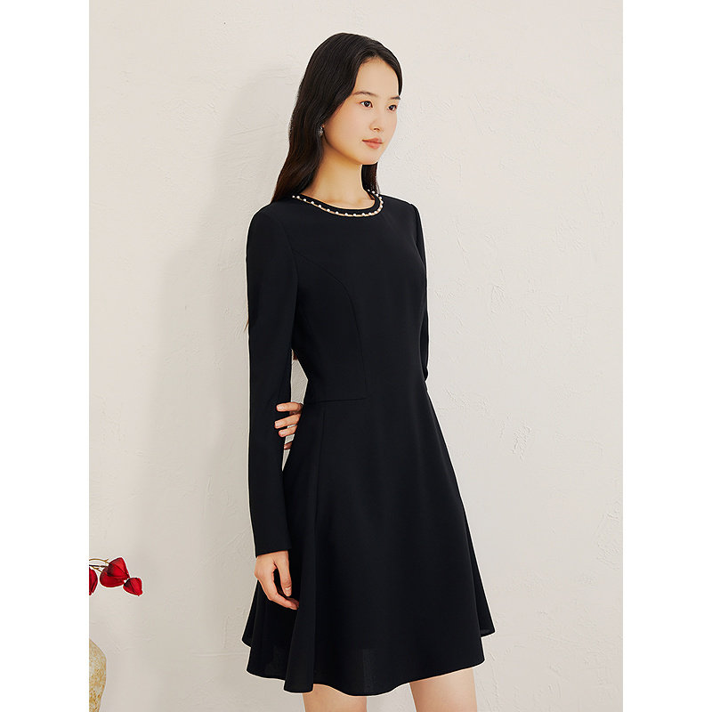 【舒心】YINER音儿专选新款经典小黑裙珍珠镂空领醋酸混纺连衣裙