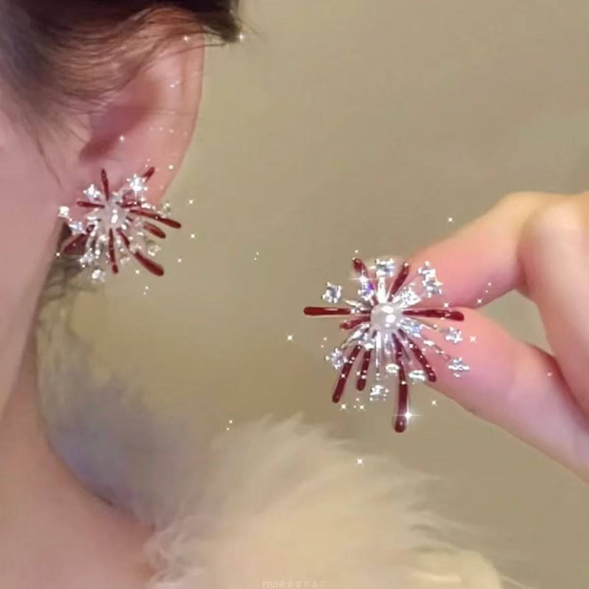 新年烟花耳钉耳环精致小巧红色花朵设计气质百搭轻奢耳饰女锆石
