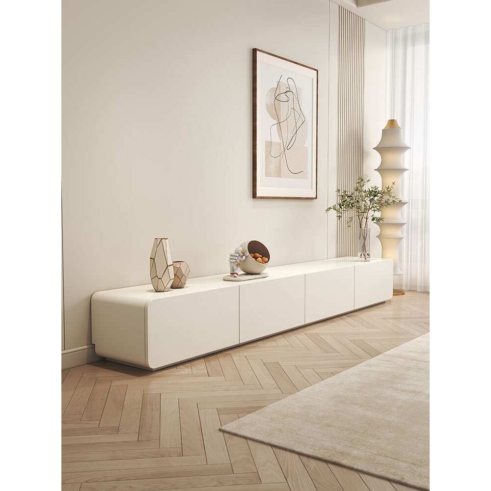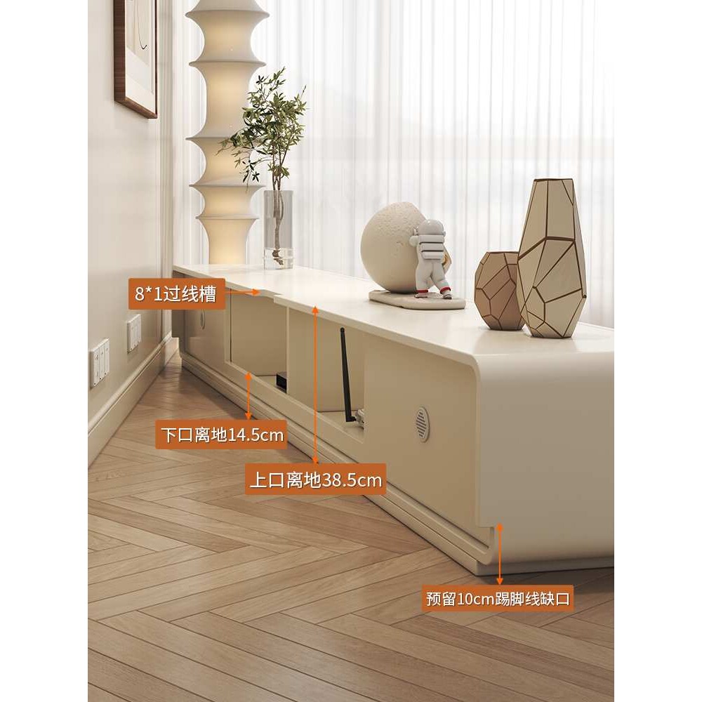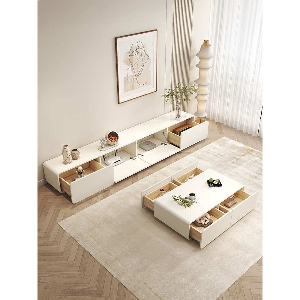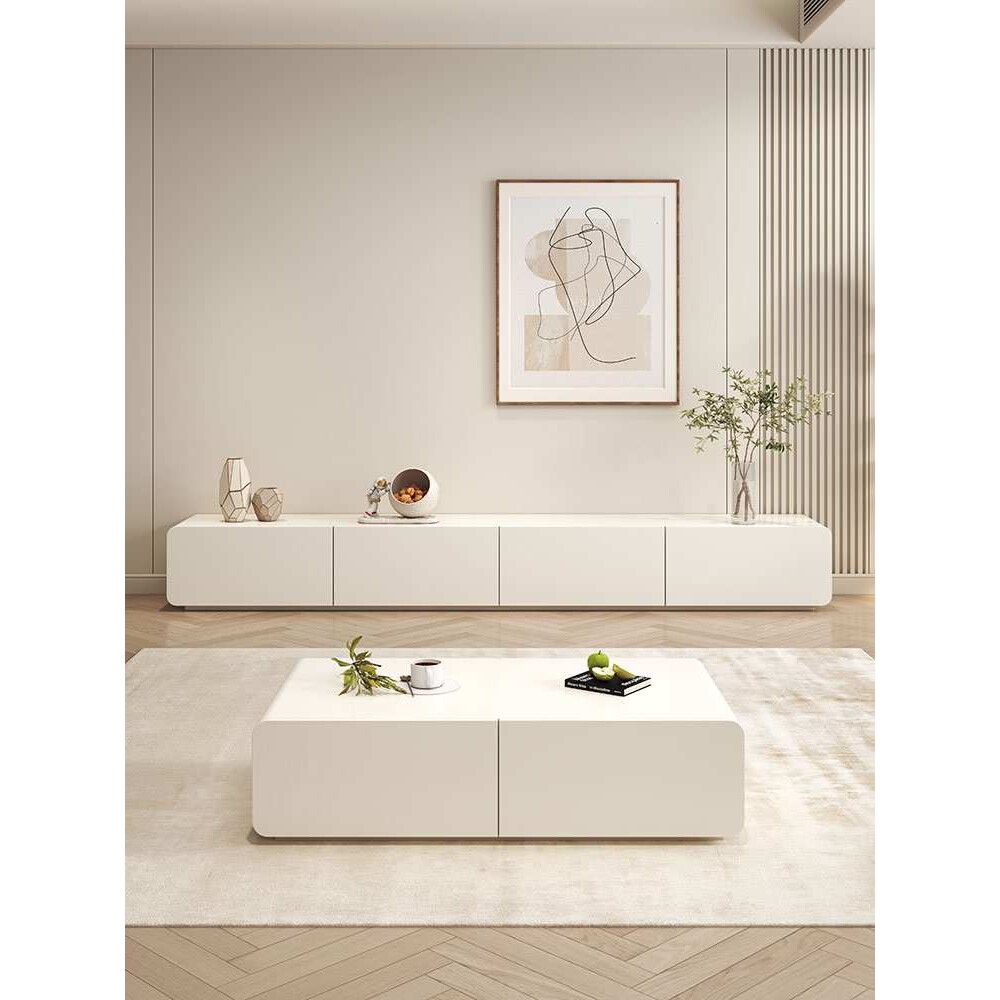 奶油风电视柜茶几组合现代简约实木圆角客厅家用白色落地电视柜