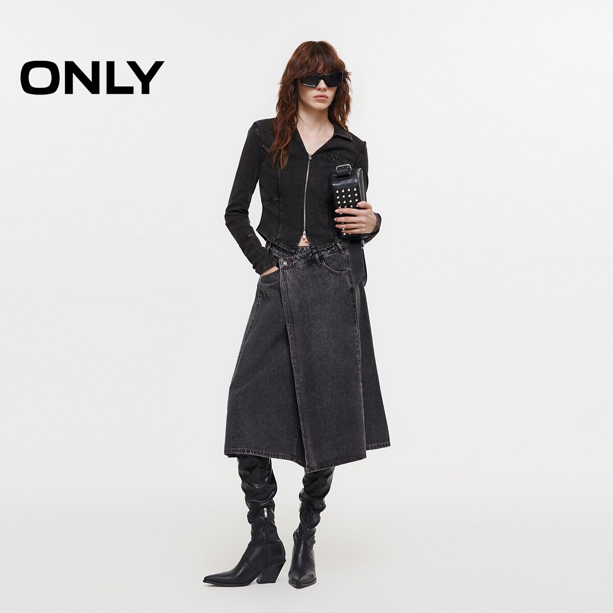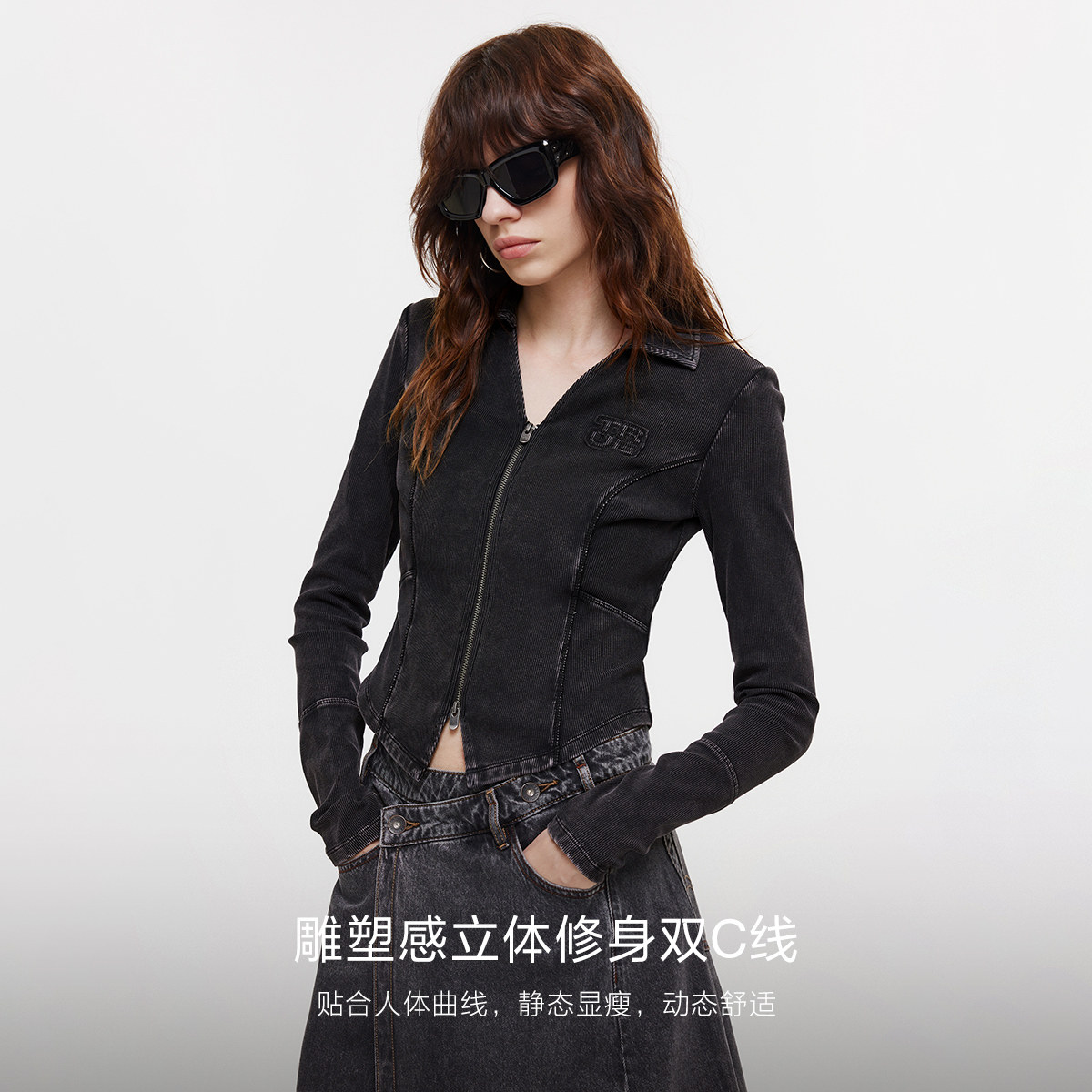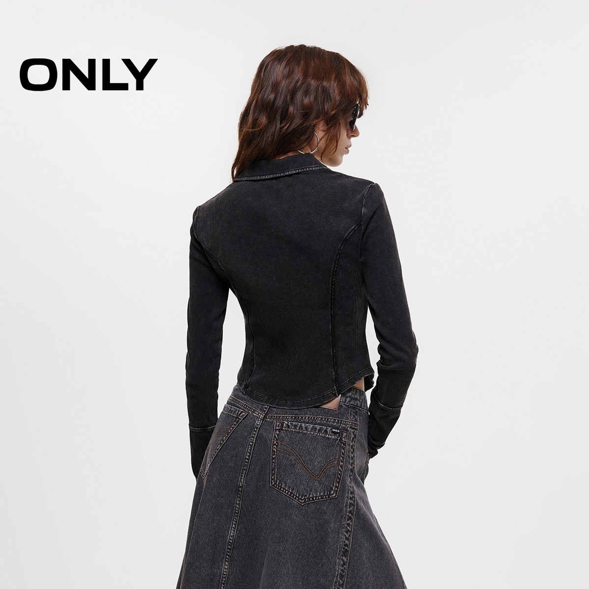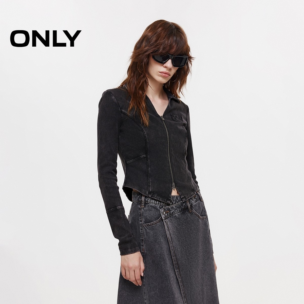 ONLY2026春季新款上衣实用双向拉链V字翻领双C剪裁修身长袖T恤女