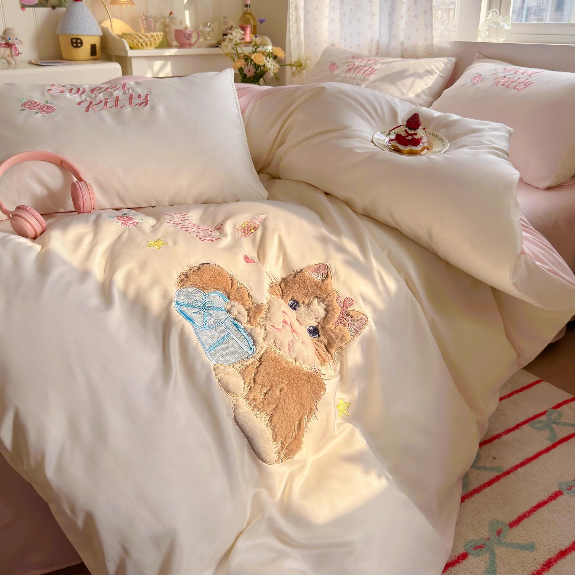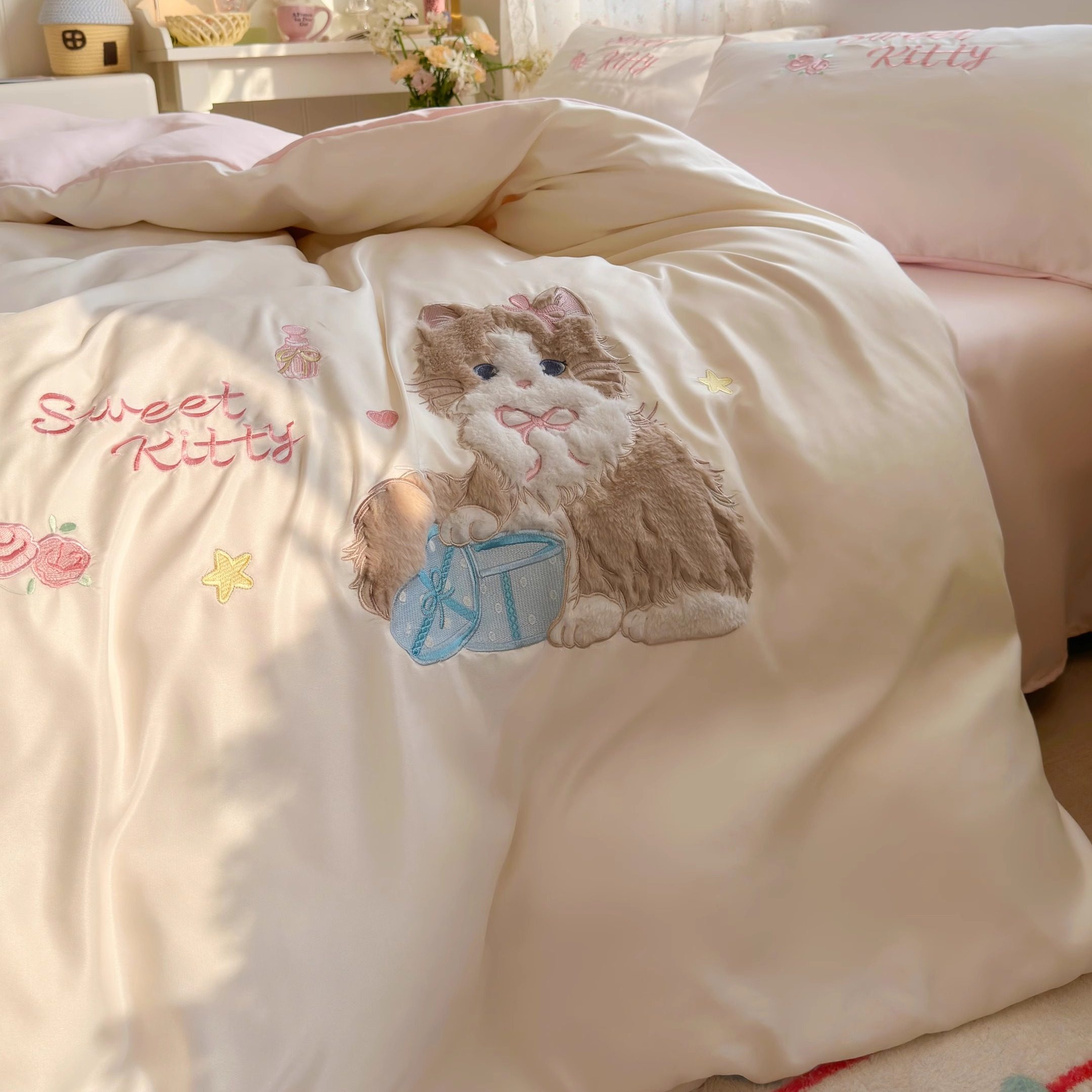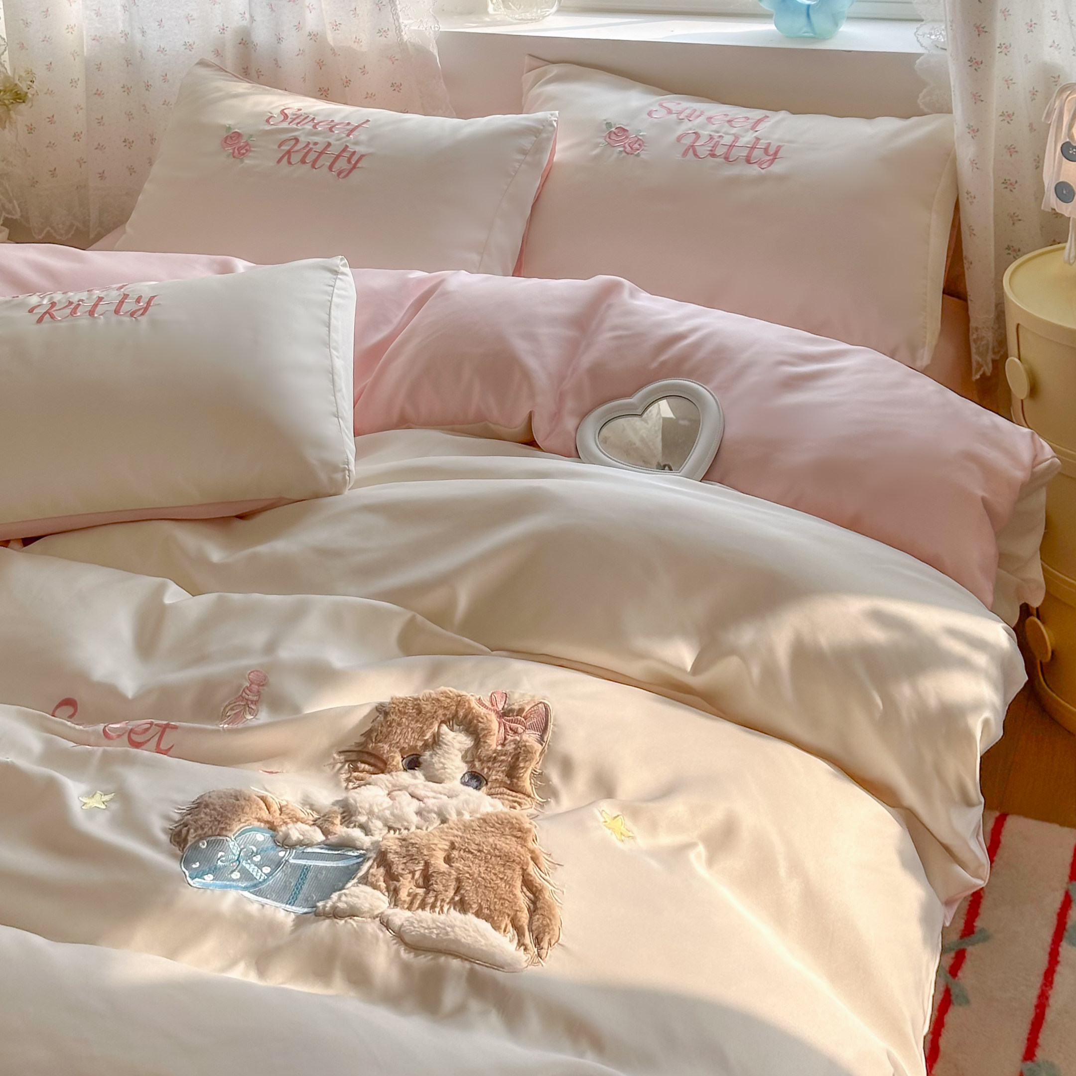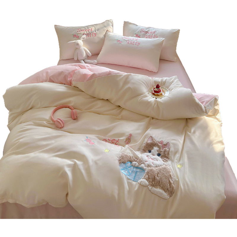 少女心贴布绣四件套冰丝夏凉被套夏天丝滑裸睡床单学生宿舍三件套
