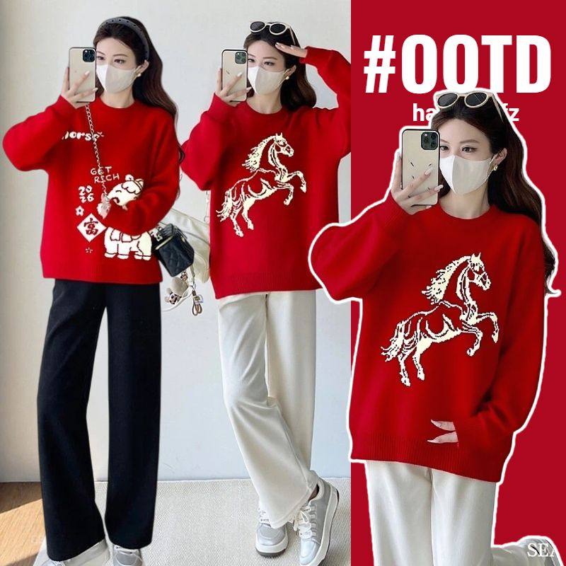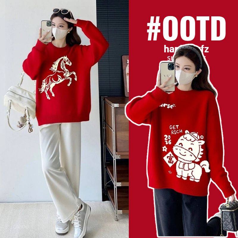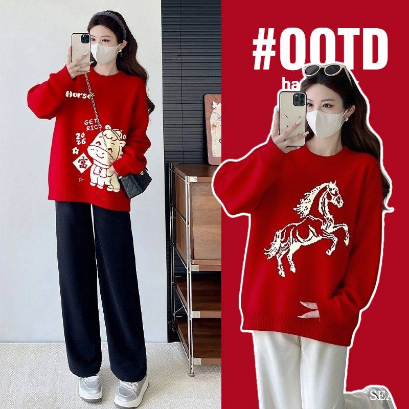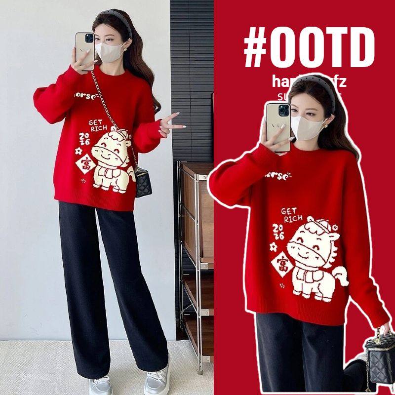 婧麒孕妇毛衣2025新款秋冬季宽松红色毛衣百搭外穿休闲款保暖上衣
