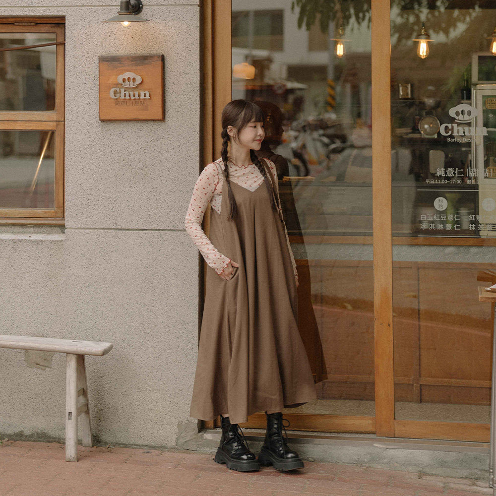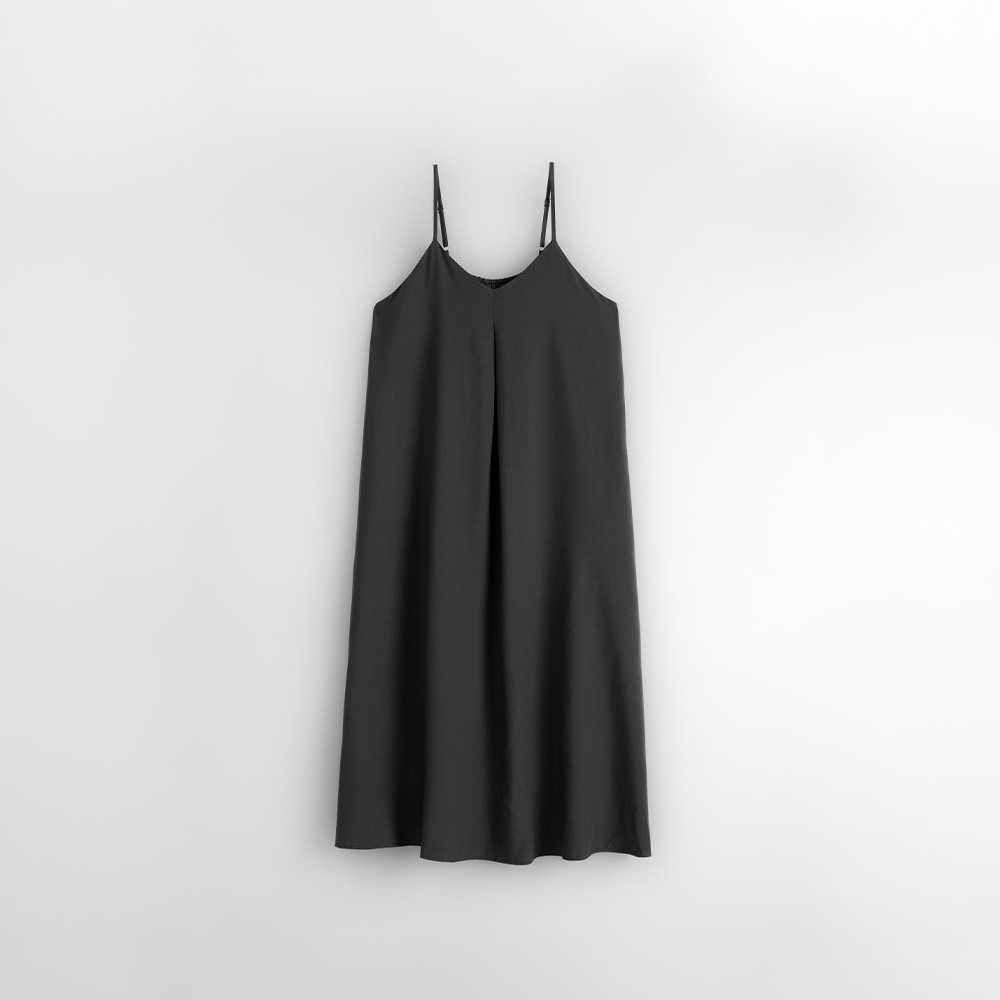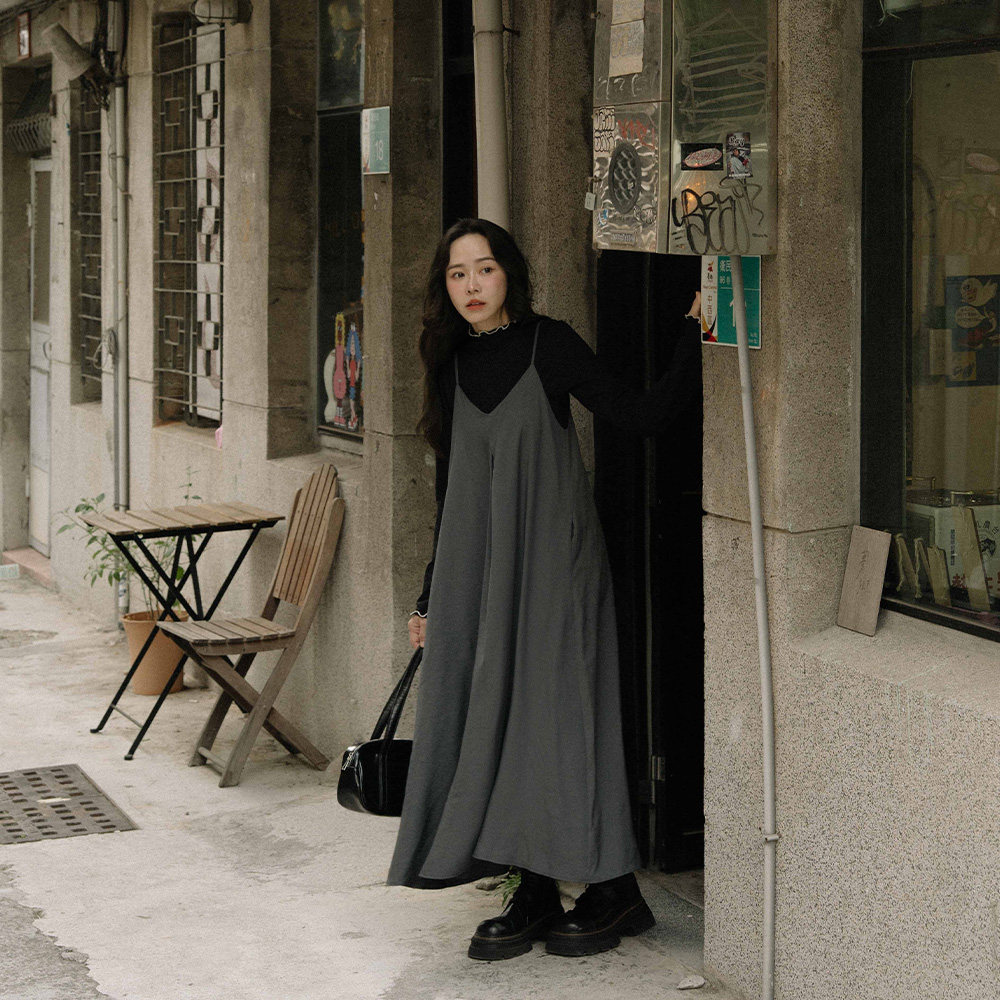 QUEENSHOP 2025秋冬新品女装质感V领打褶设计细肩连衣裙01087137