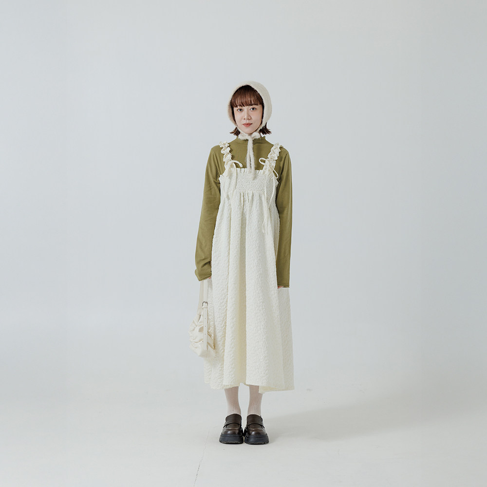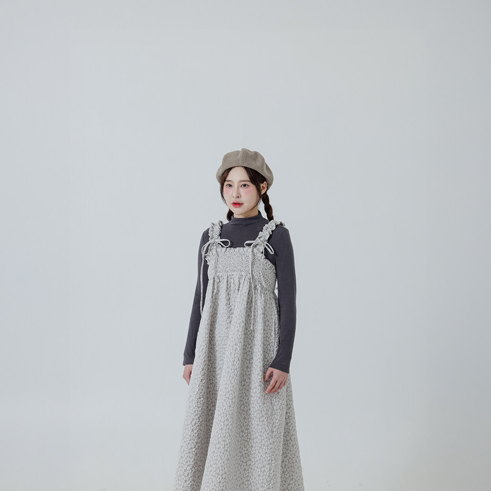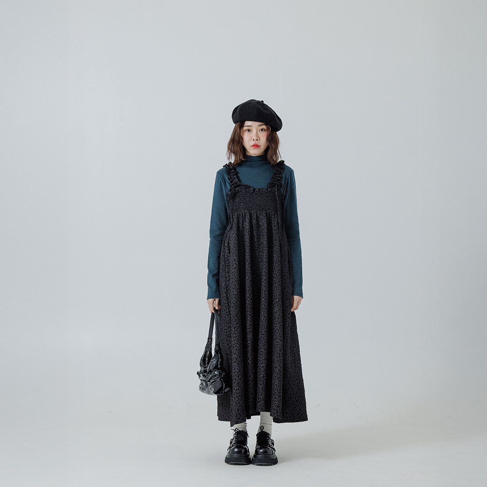 QUEENSHOP 2025秋冬新品女装质感缇花肩抽皱绑带连衣裙01087167