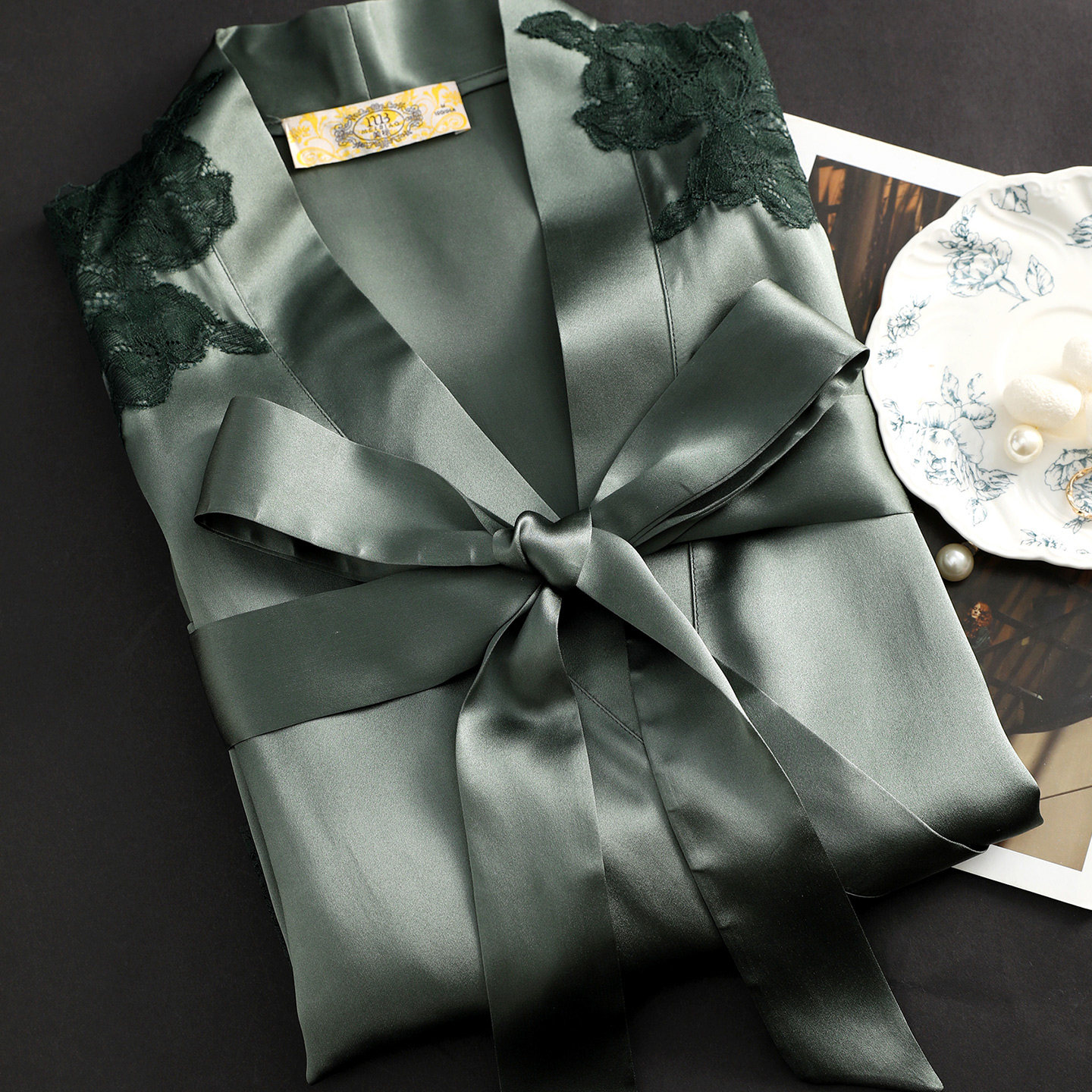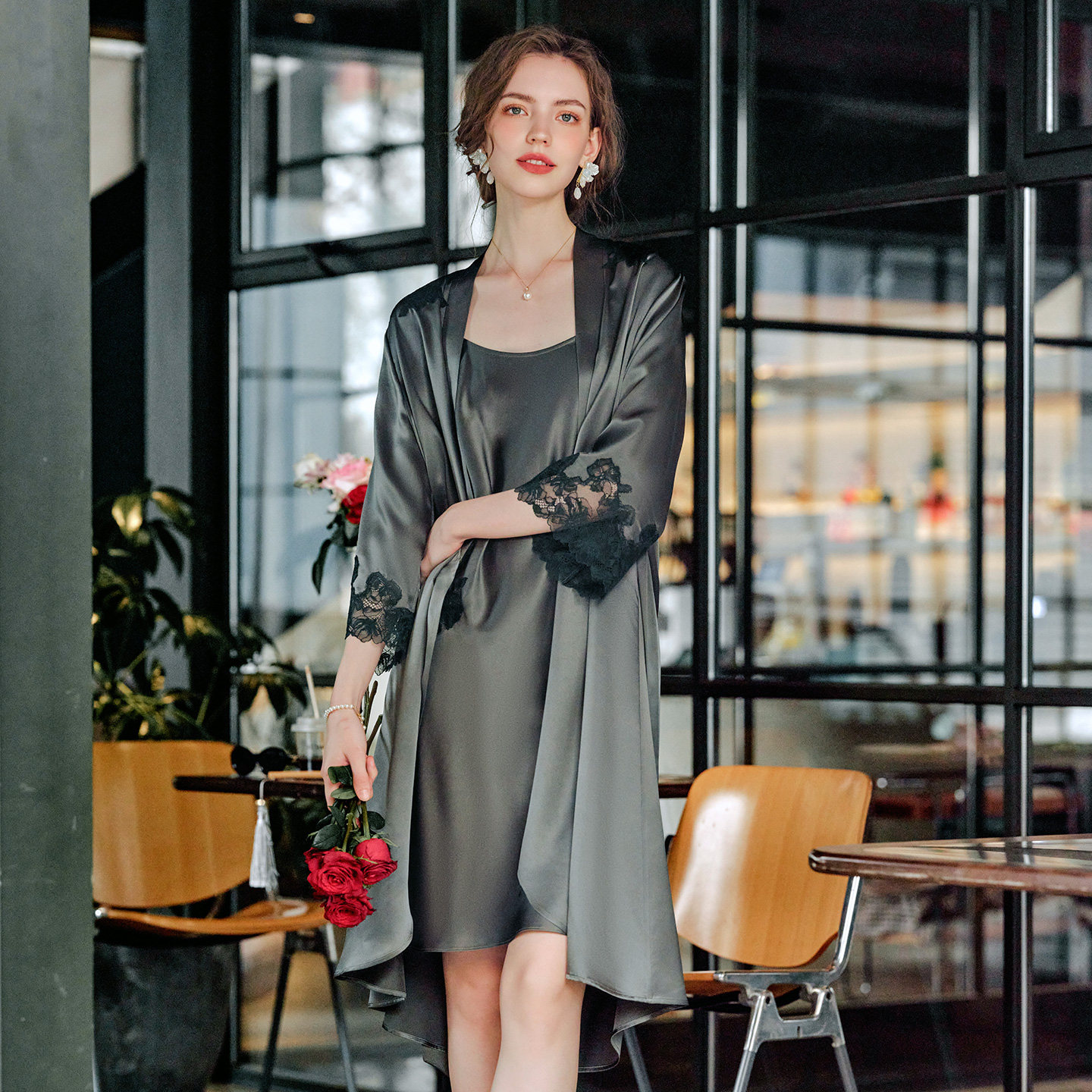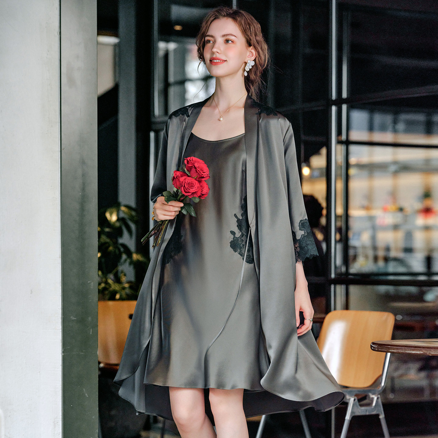 美标春秋新品真丝吊带睡裙长袖睡袍两件套女桑蚕丝家居服丝绸睡衣