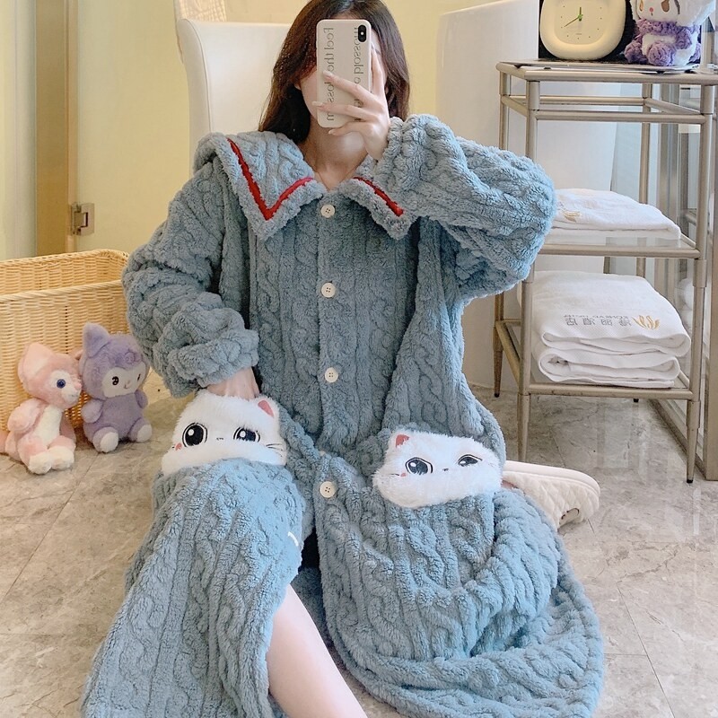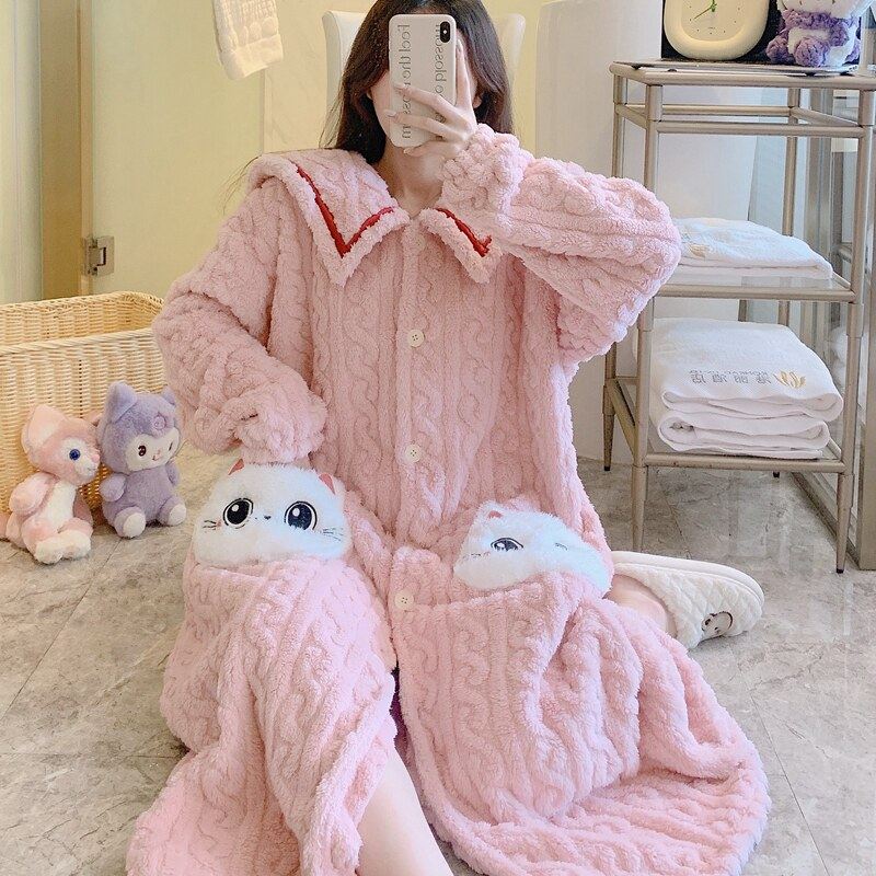 可爱小丑鱼睡衣长款女新款秋冬季珊瑚绒睡袍网红加厚珊瑚绒家居服