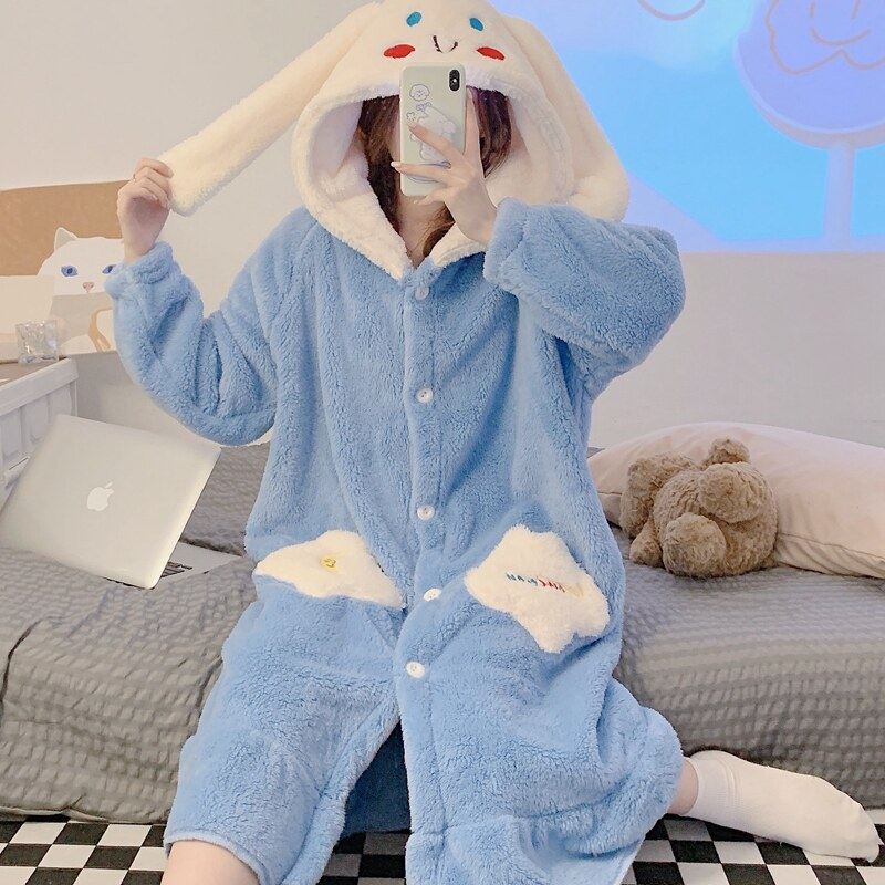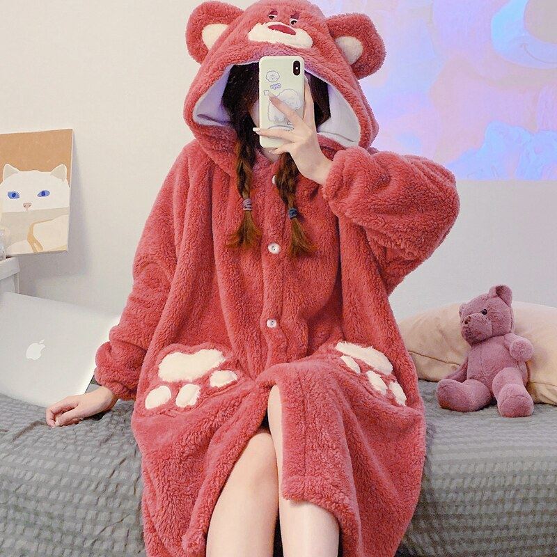 yso【酷猫系列】睡衣女秋冬新款毛绒长款连帽加厚保暖开衫睡袍D