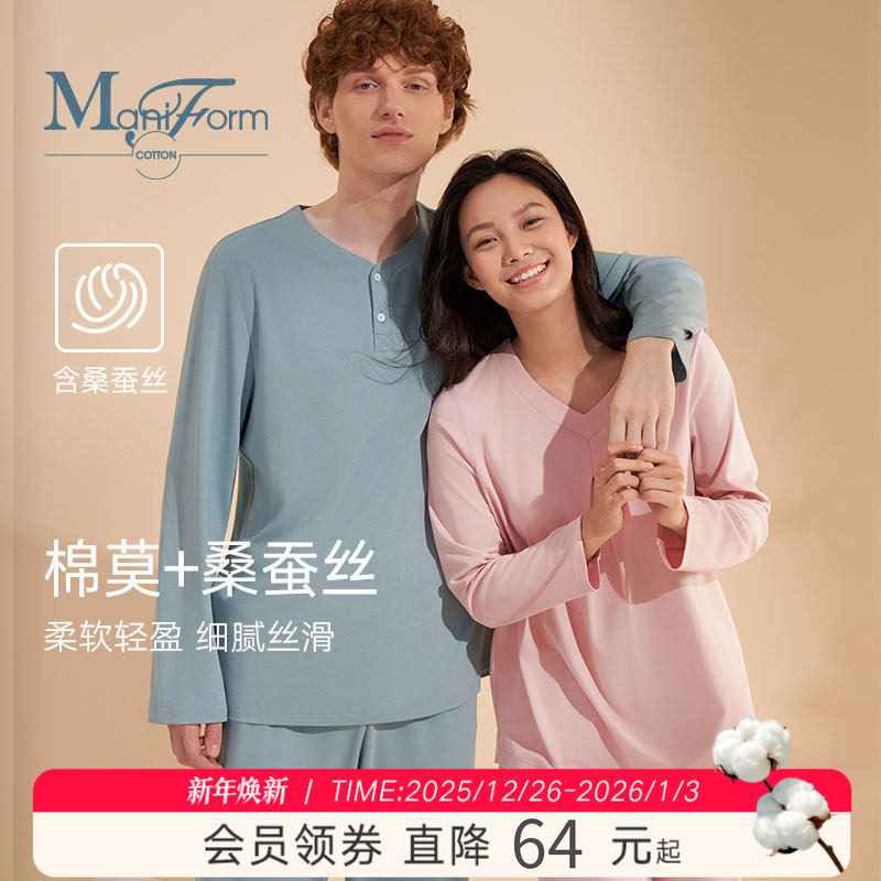 曼妮芬棉质生活冬季睡衣女长袖长裤套装60支棉莫代尔桑蚕丝家居服