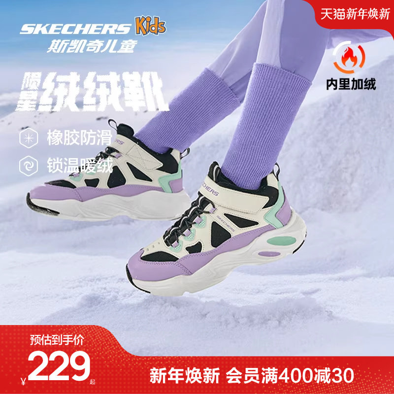 Skechers斯凯奇儿童绒绒靴冬季男女童棉鞋保暖加厚防滑休闲运动鞋
