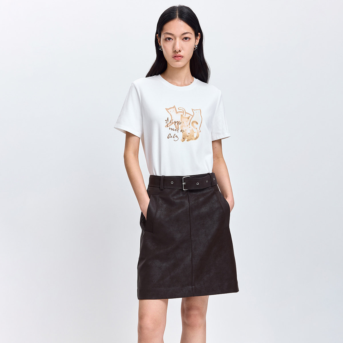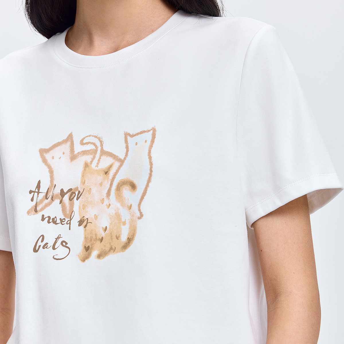LILY2026春新款简约撞色猫咪图案休闲白色圆领短袖T恤内搭上衣女