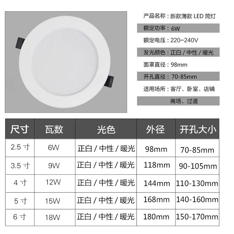 led超薄筒灯嵌入式开孔4寸5寸3寸6寸9W12W孔灯吊顶18w天花灯客厅