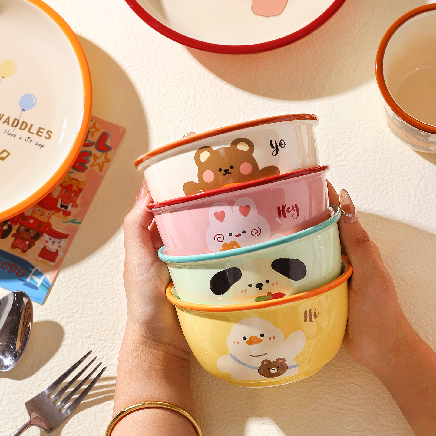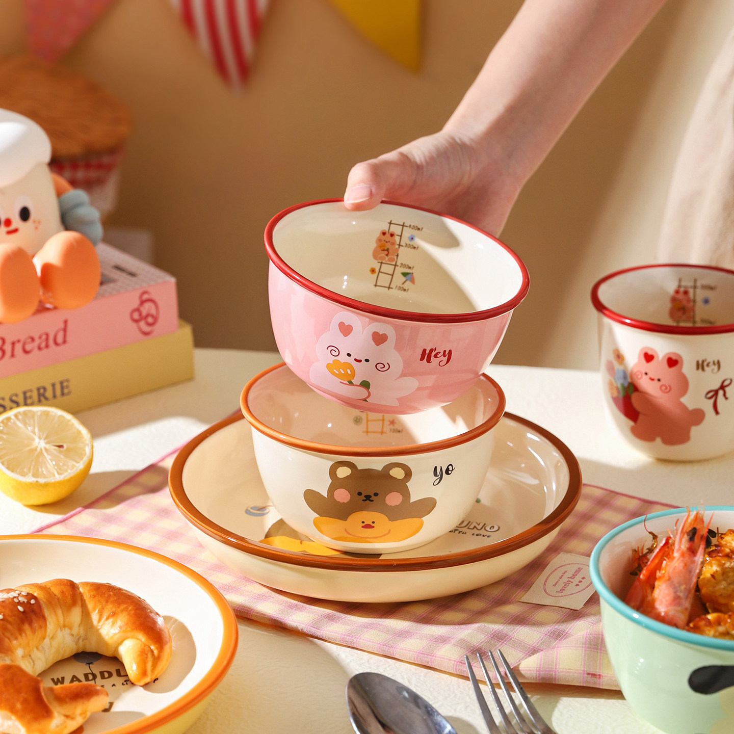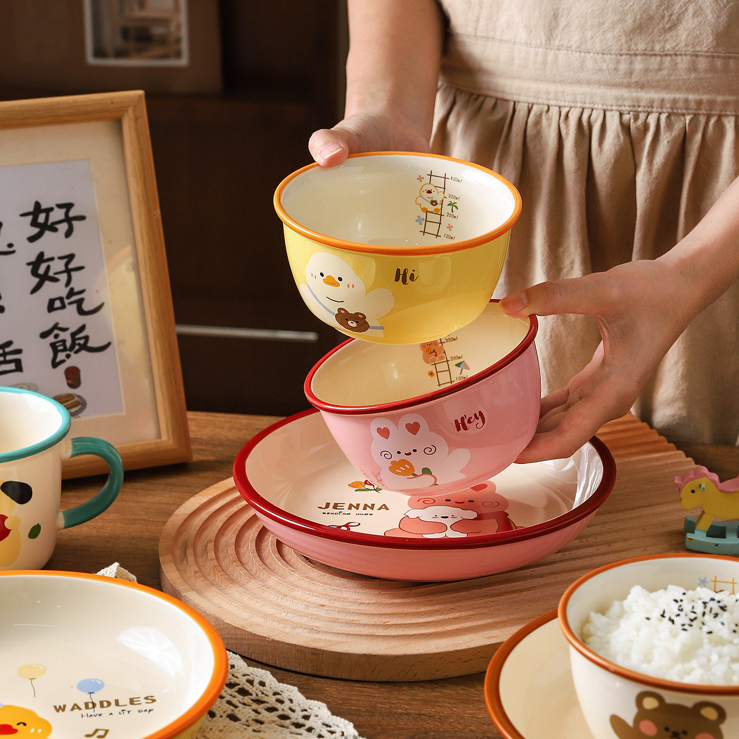奶油风陶瓷碗家用卡通菜盘子可爱米饭碗汤碗釉下彩儿童餐具耐高温