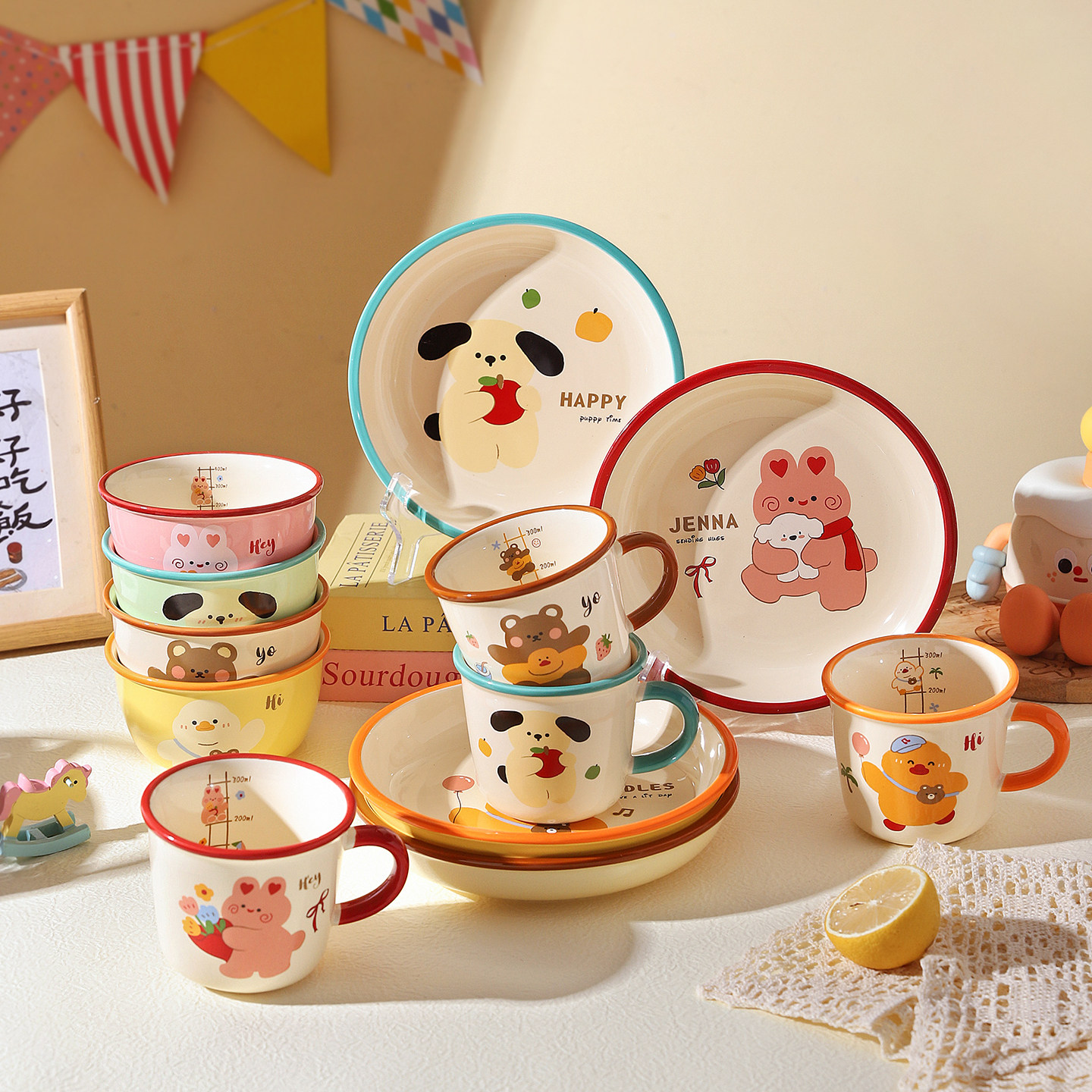 舍里可爱卡通碗碟套装家用陶瓷碗盘组合釉下彩米饭碗深盘马克杯