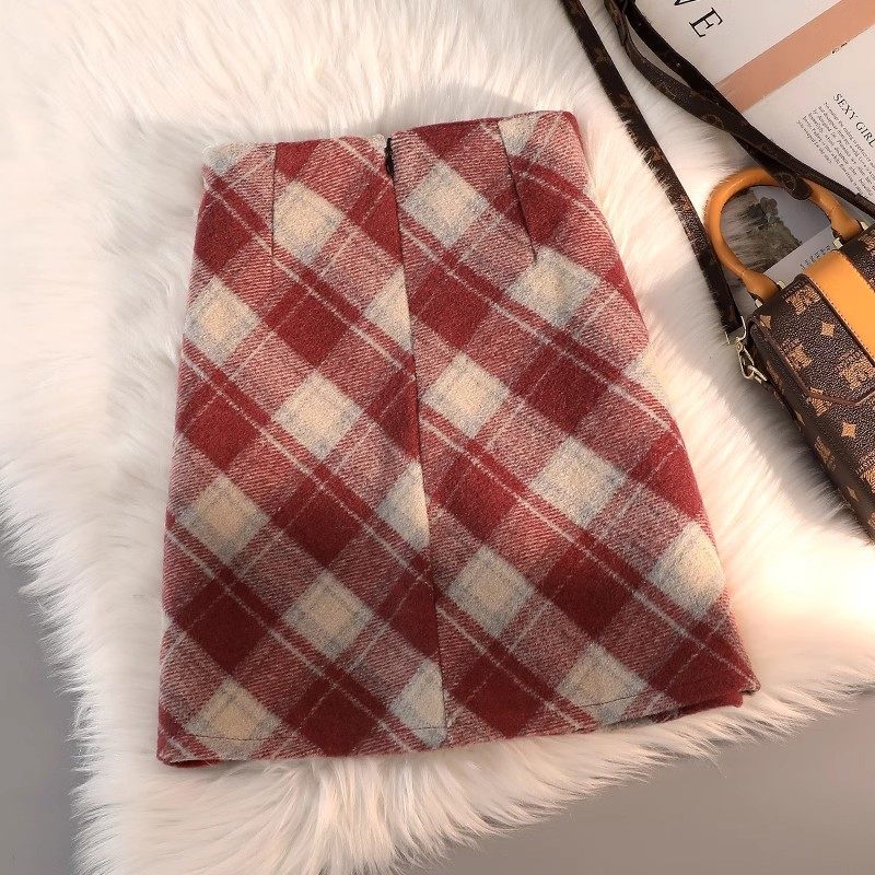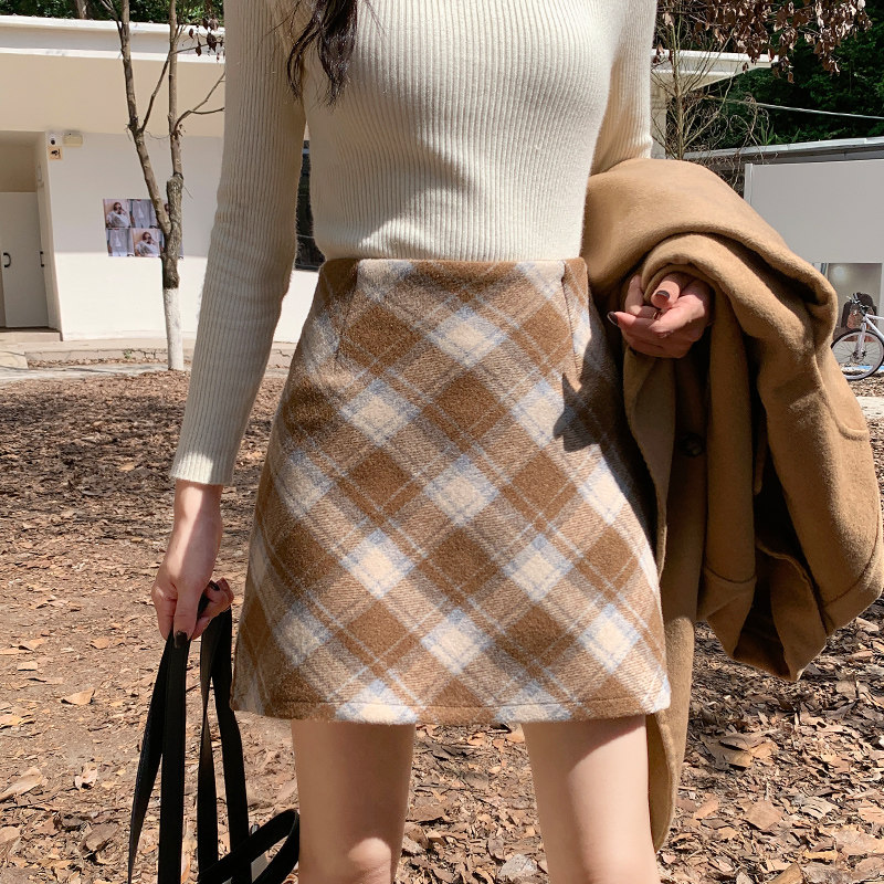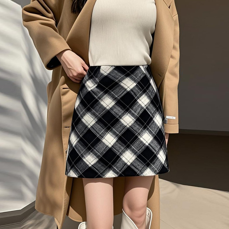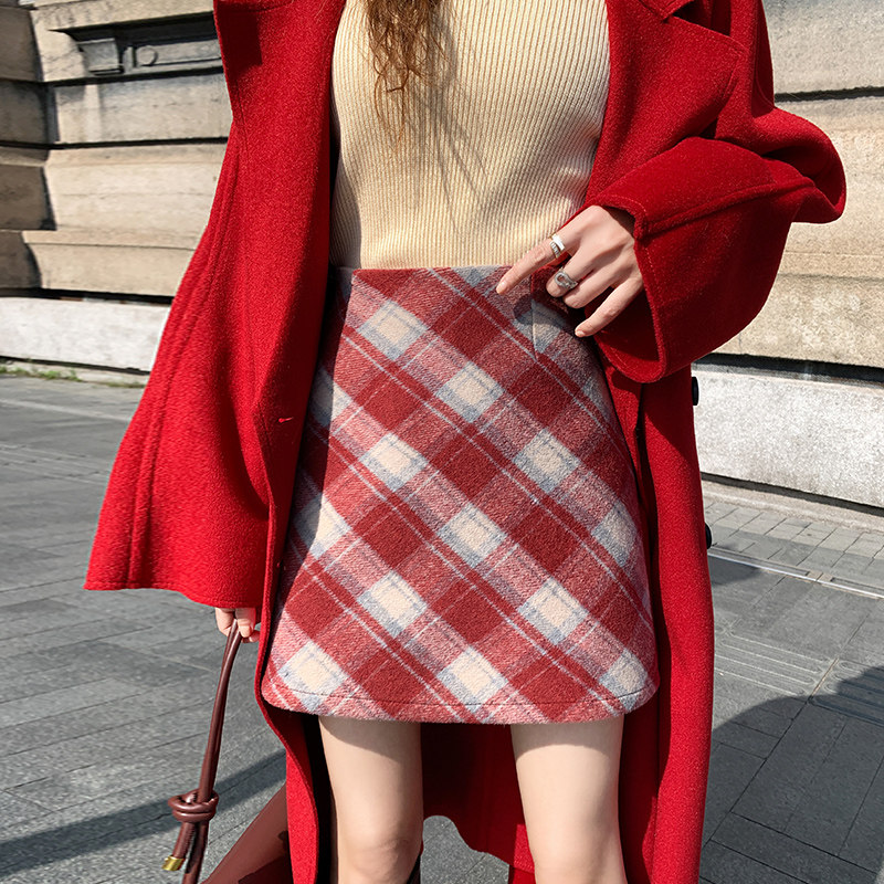 大码格子毛呢短裙半身裙女秋冬新款高腰直筒复古防走光a字包臀裙