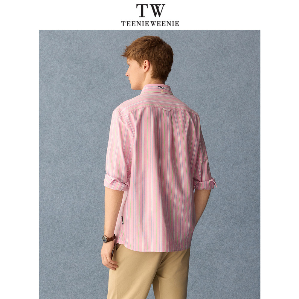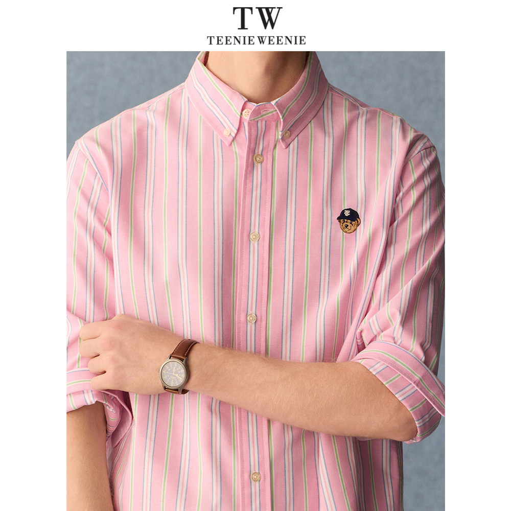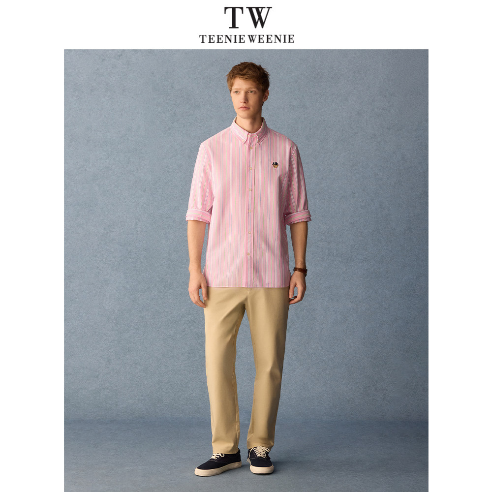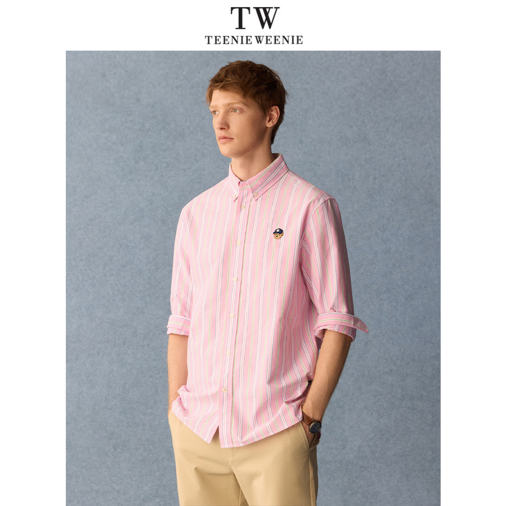 Teenie Weenie小熊男装休闲纯棉刺绣条纹翻领长袖衬衫2026年春