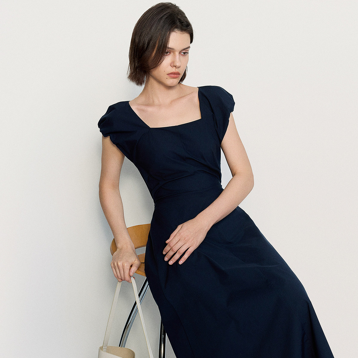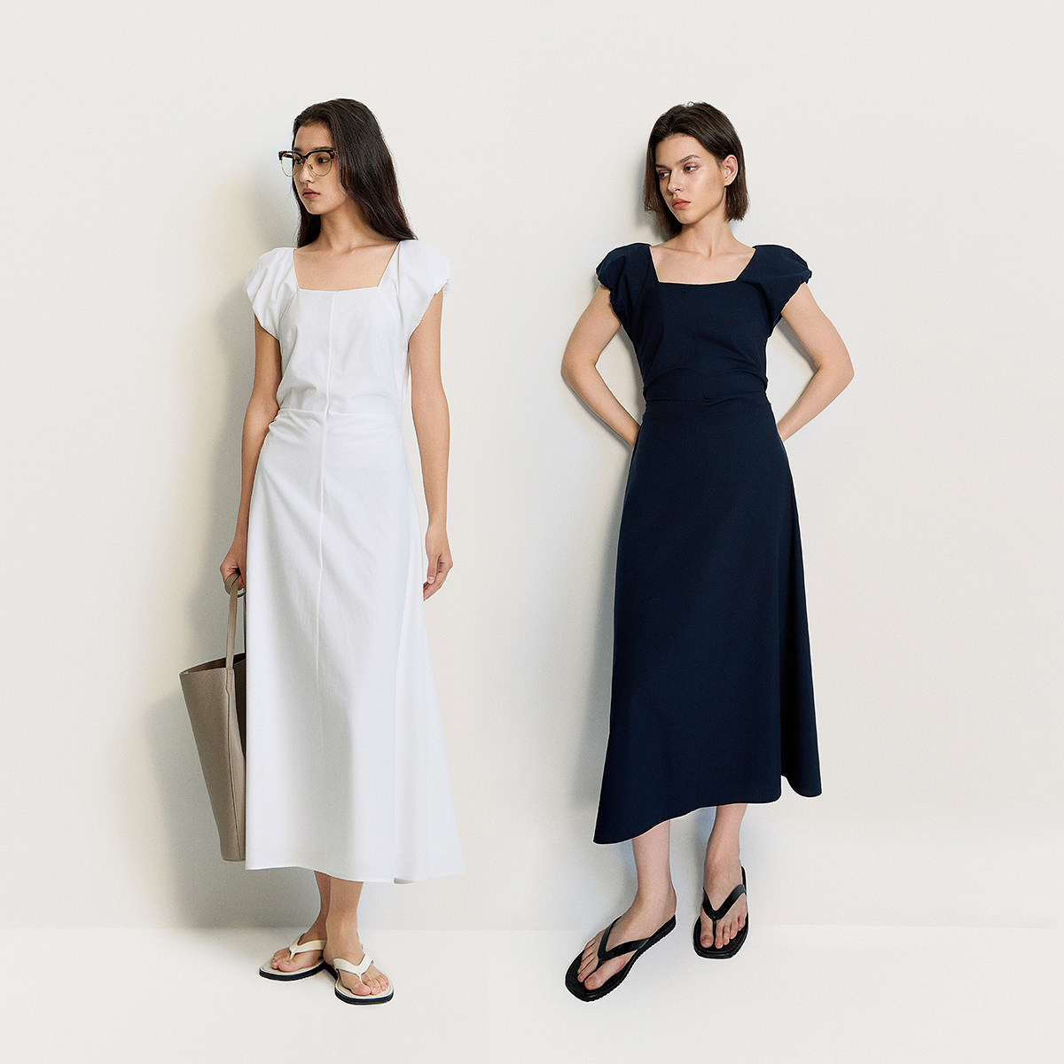 【特享折扣】欧时力方领花苞袖连衣裙长裙后露腰系带法式2025夏新