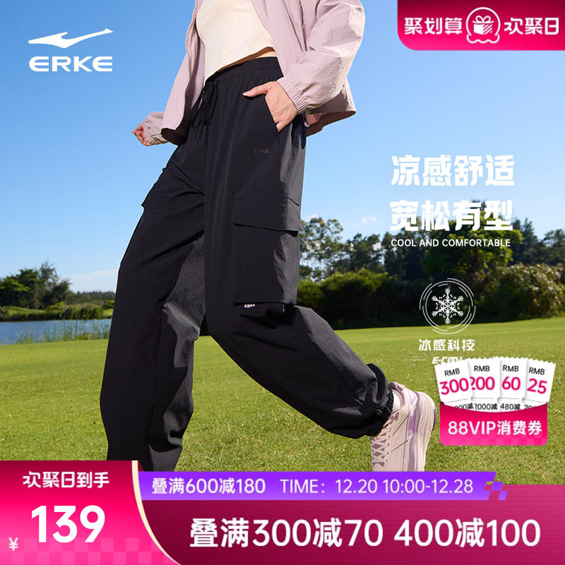 鸿星尔克运动裤女新款女士冰丝工装裤女款黑色宽松裤子女裤休闲裤
