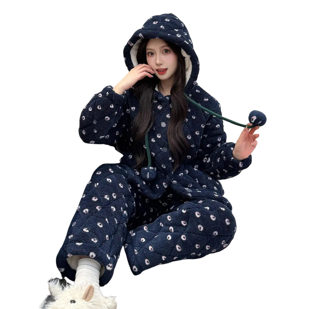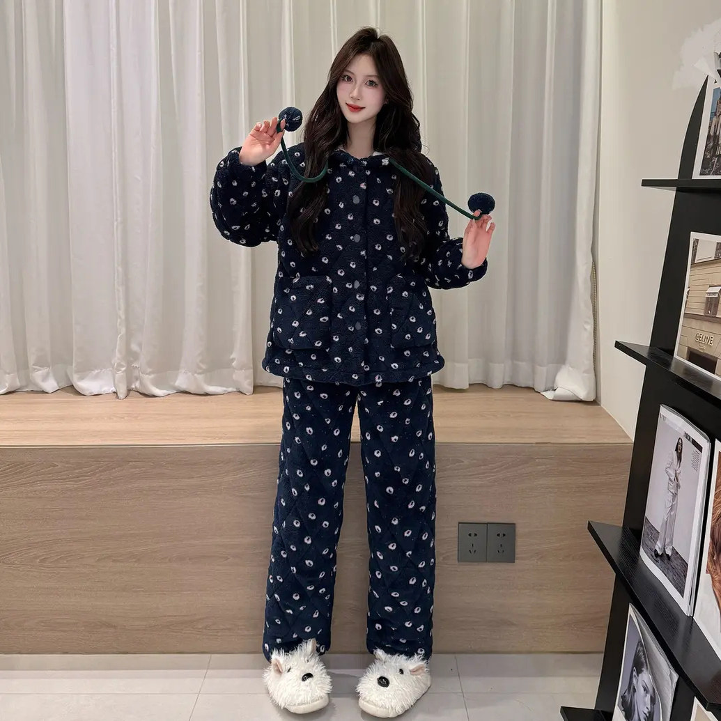 三层夹棉睡衣女款冬季2026加厚保暖珊瑚绒女生冬天家居服套装加绒