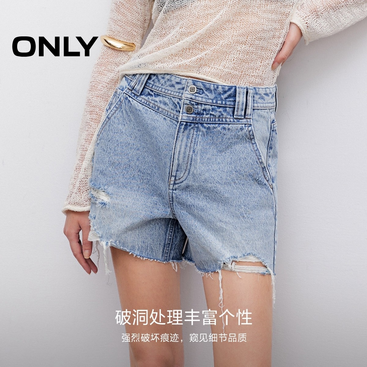 ONLY夏季复古水洗做旧设计显瘦高腰破洞短裤牛仔裤女