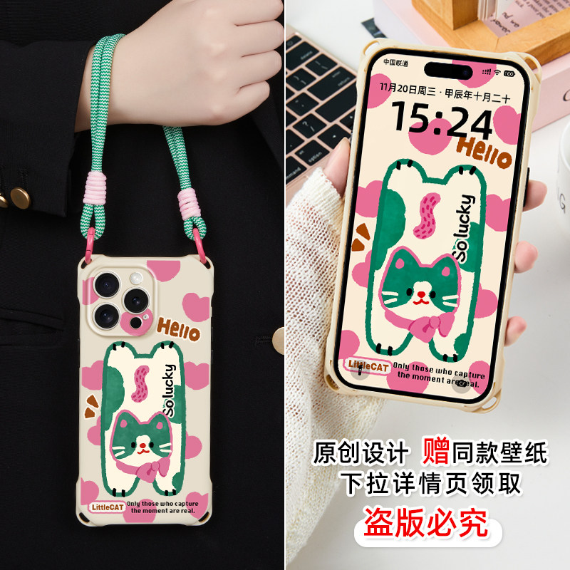 原创猫猫适用华为pura80苹果16promax手机壳小众17新款支架mate70卡通可爱斜跨iphone14手提斜挎挂绳小米15
