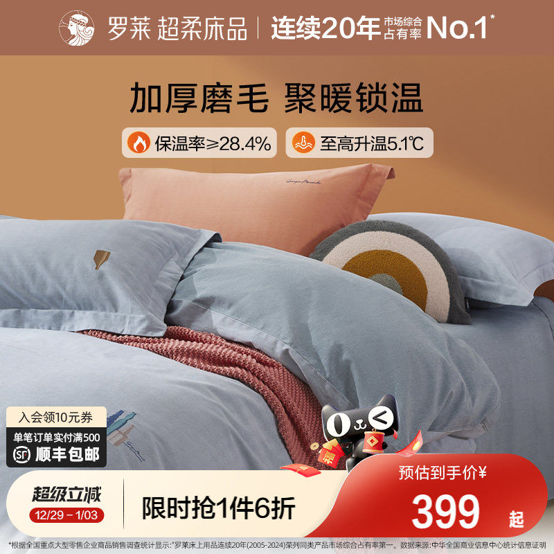 罗莱家纺床上用品全棉秋冬磨毛1.8m床单被套双人床四件套