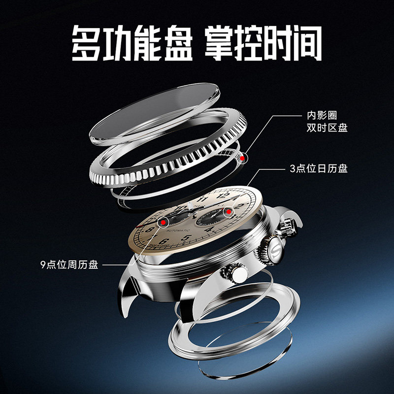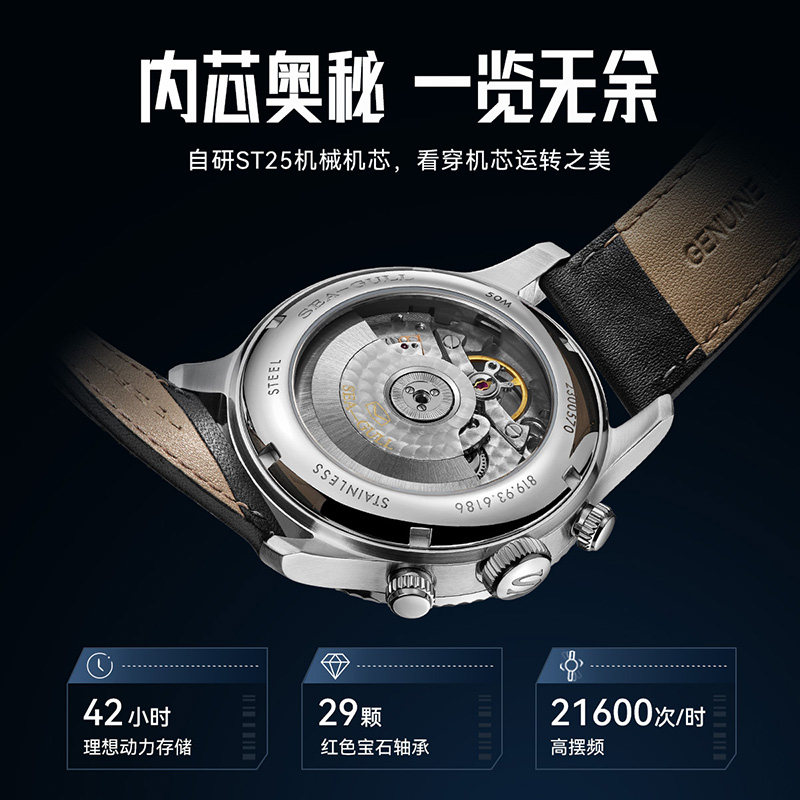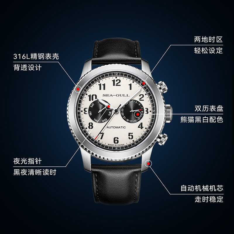 海鸥表男士双时区自动机械表夜光指针时尚运动皮带手表6186