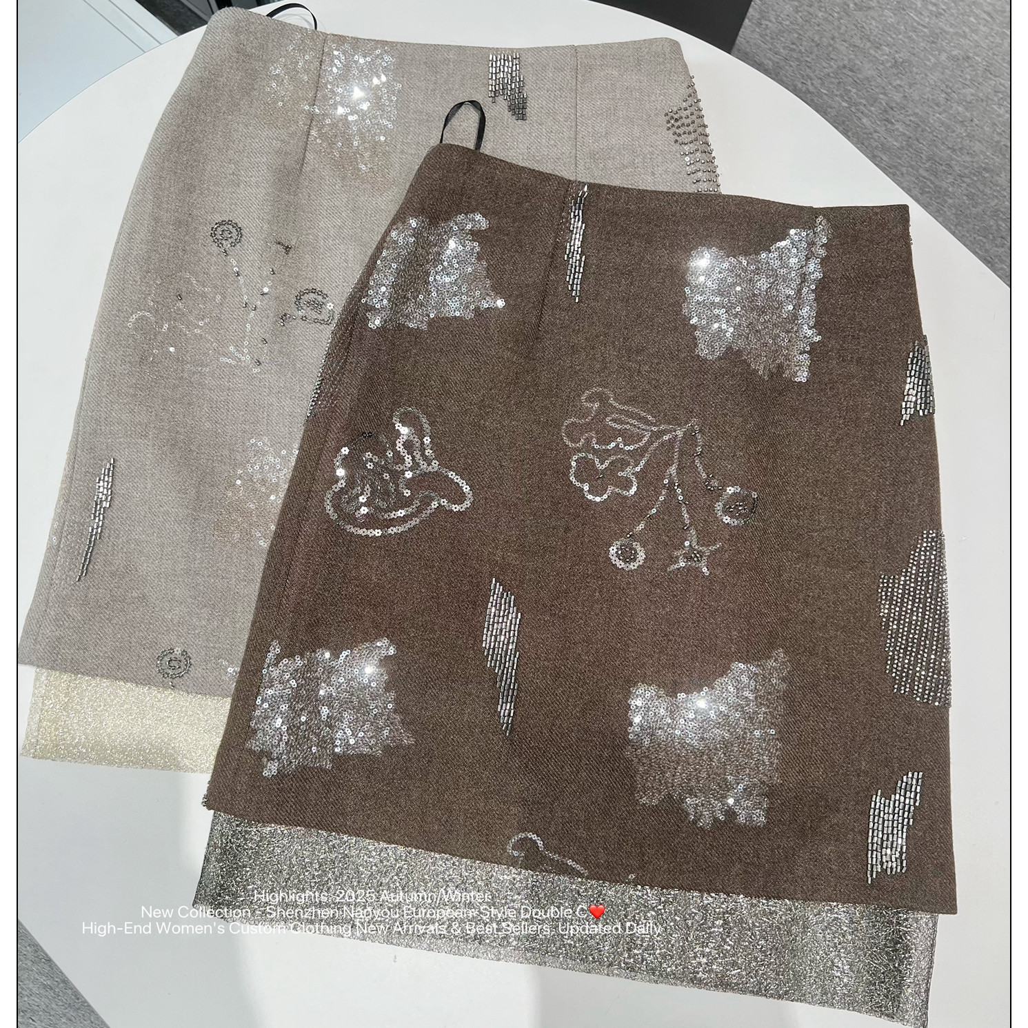 双C高端定制女装2025新加厚咖色亮片半身裙女高腰显瘦通勤包臀裙