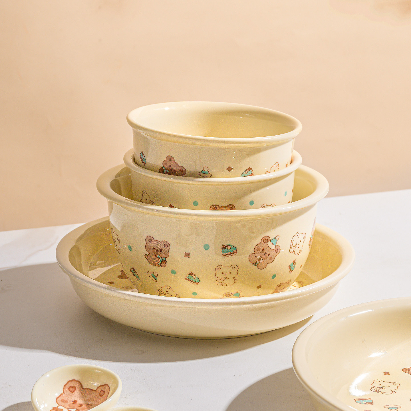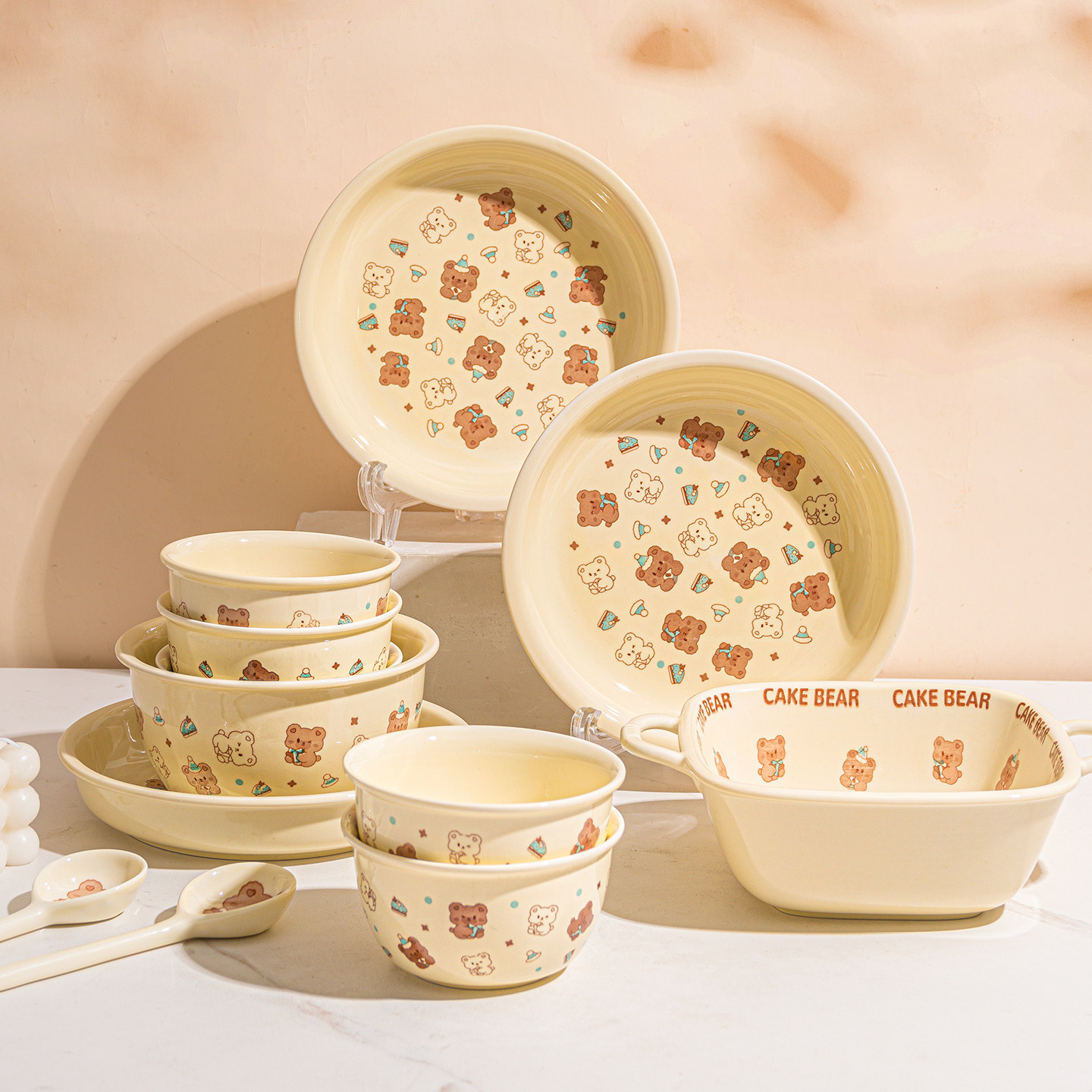 奶油风陶瓷碗家用卡通菜盘子可爱米饭碗汤碗釉下彩儿童餐具耐高温